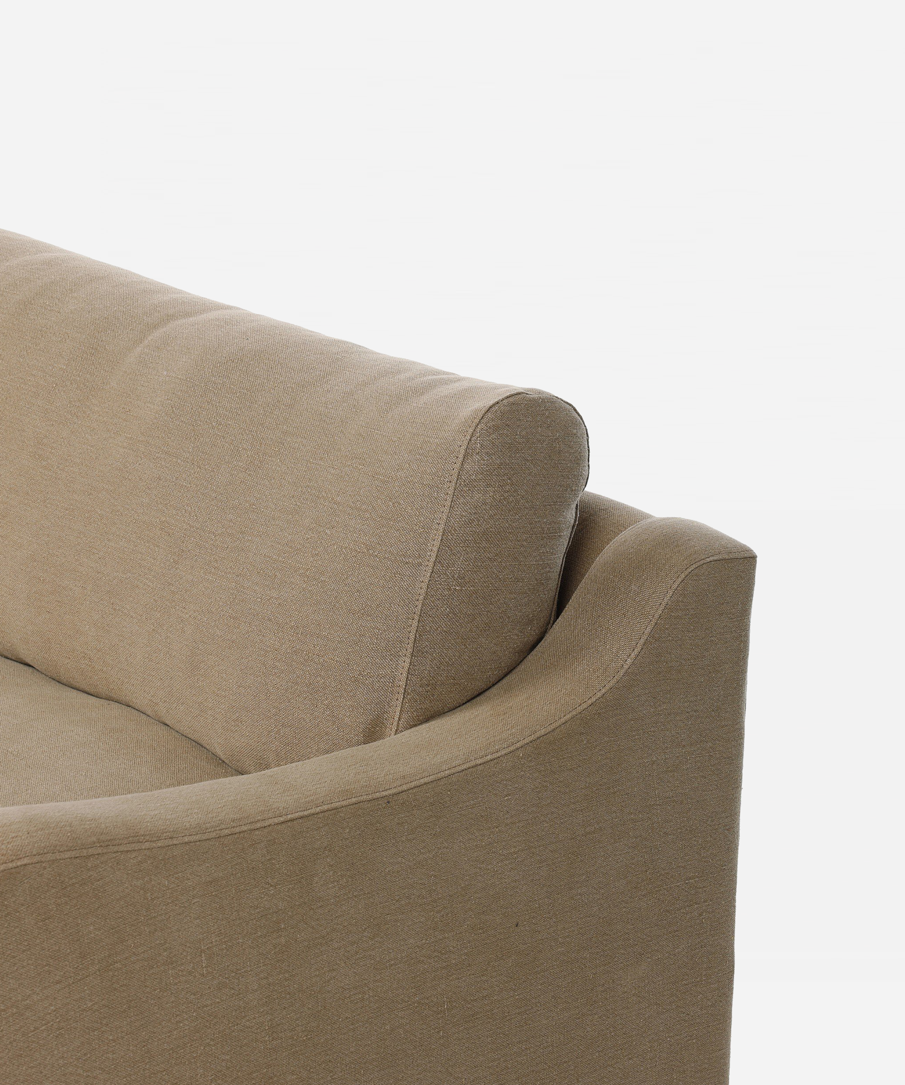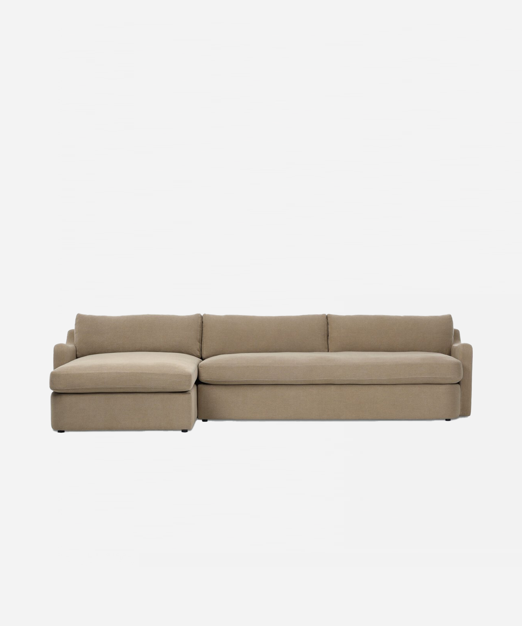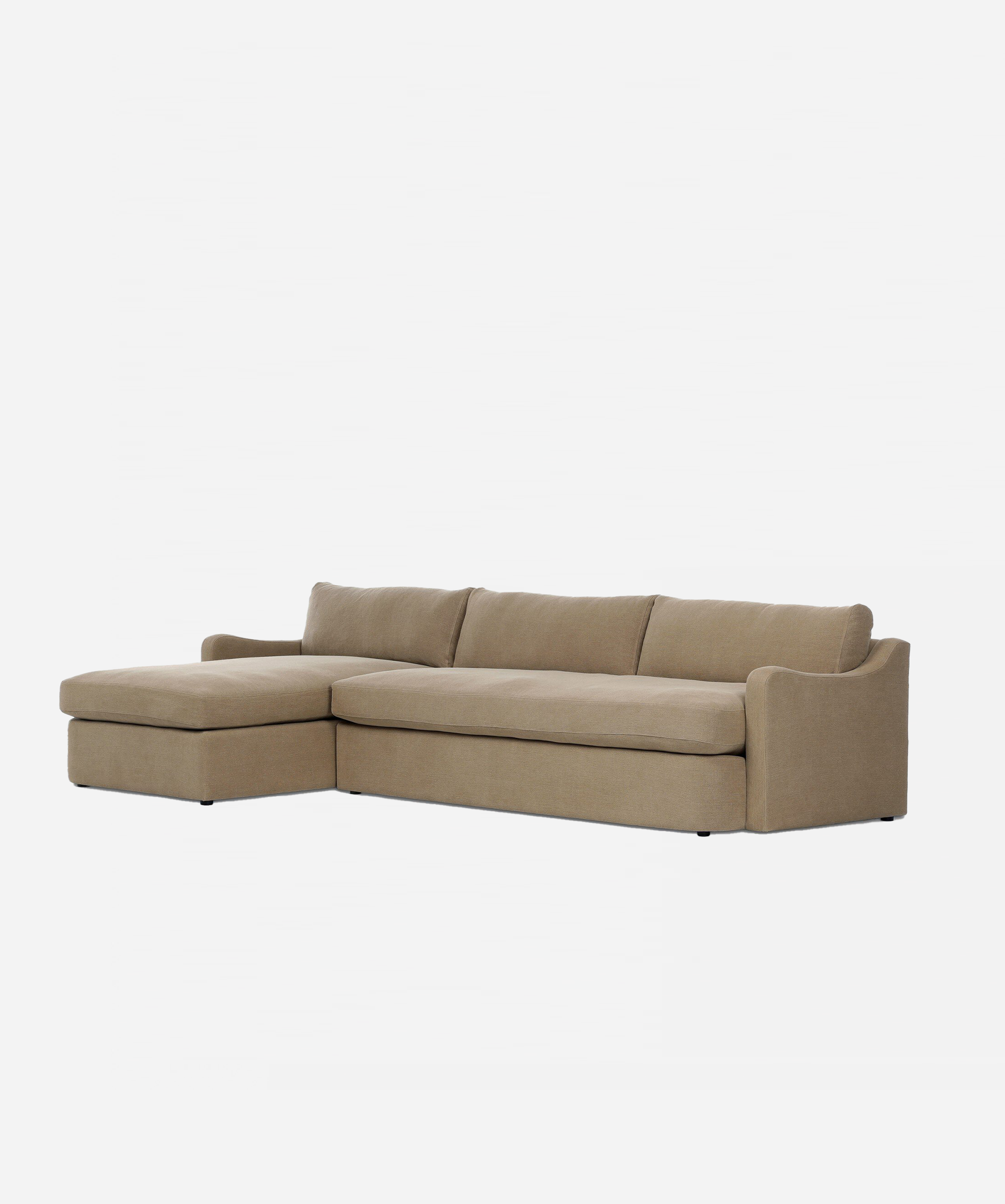 The Aerin 2-Piece Sectional marries heritage aesthetics with contemporary comfort. This right or left arm-facing sectional features distinctive sloping track arms and an elongated front deck that balance playful proportions with refined simplicity. Subtle boxing along the perimeter adds polish without excess. Inside, boxed cushions blend feather and fiber for a luxurious sink-in feel, supported by S-spring suspension for lasting comfort. Crafted entirely in 100% linen, this sectional brings understated elegance to any living space.
