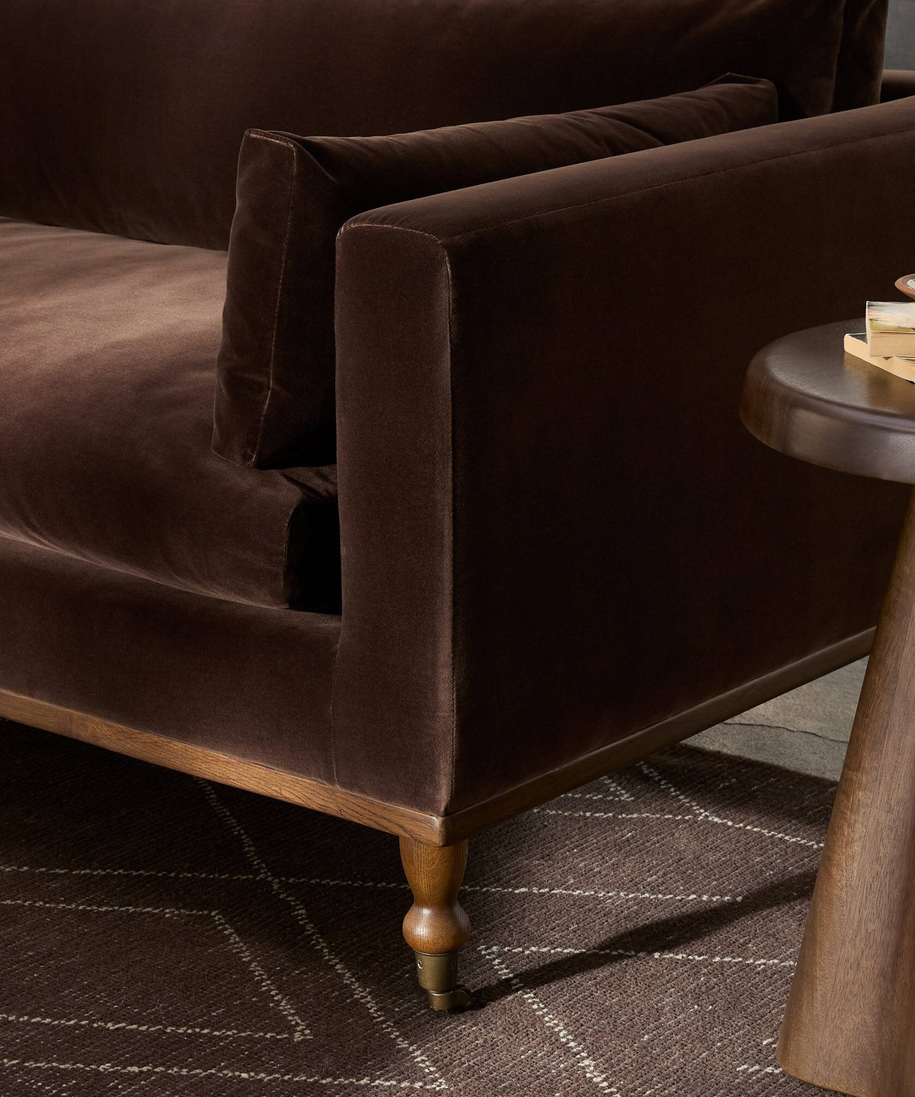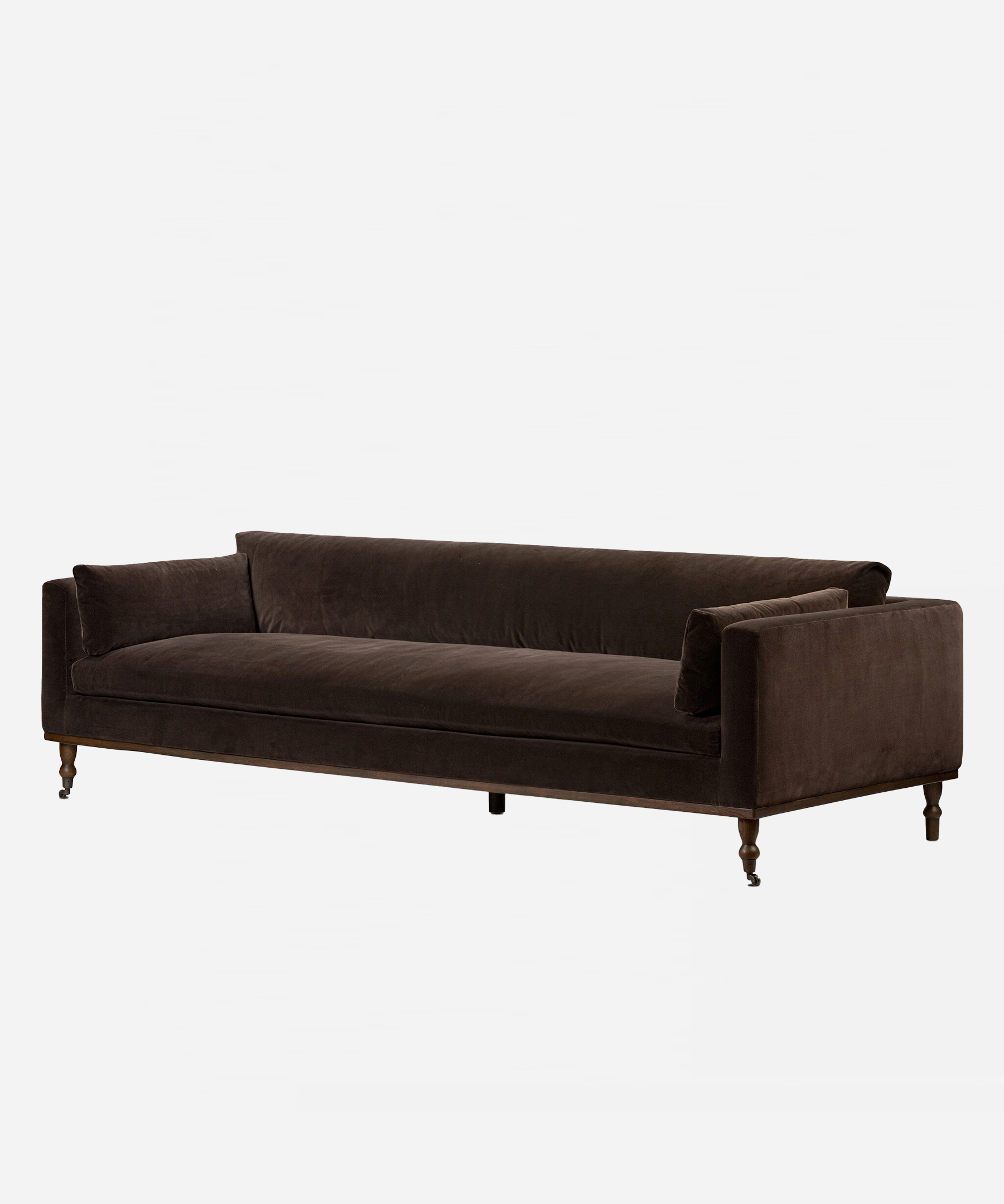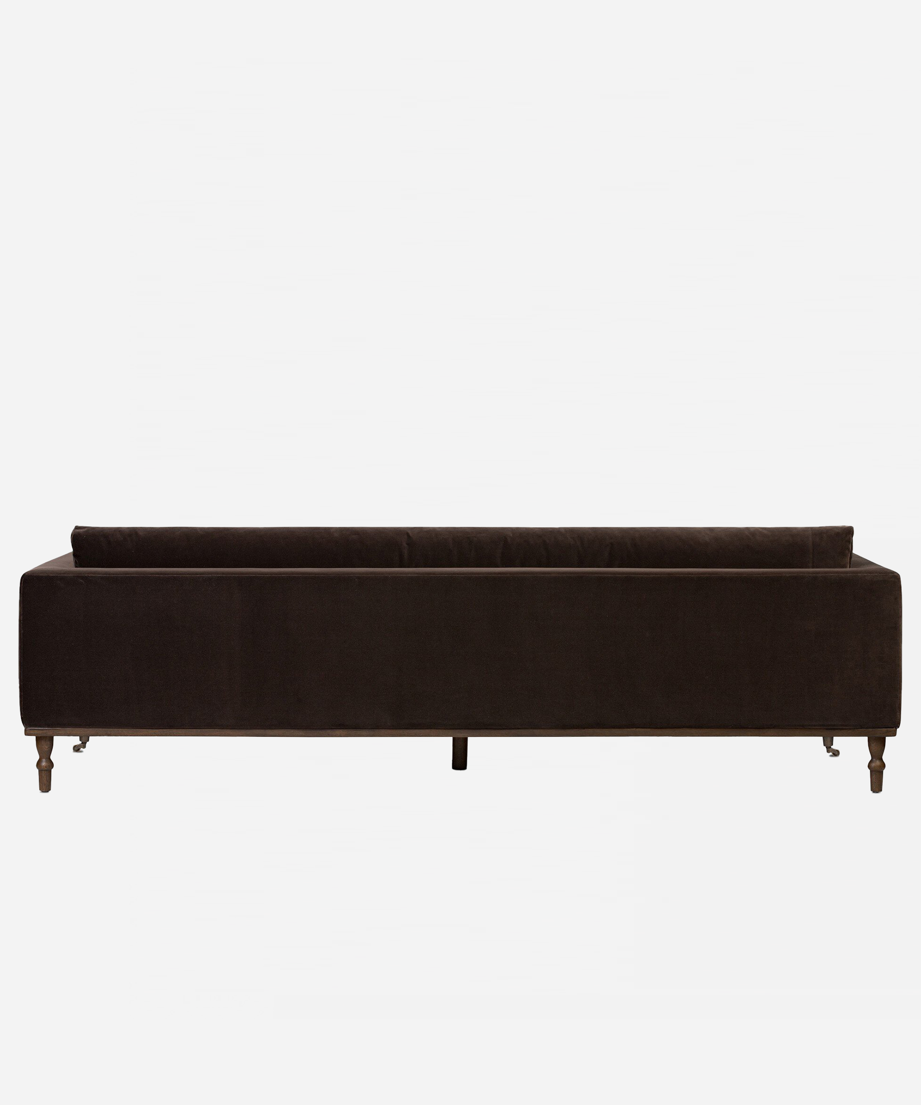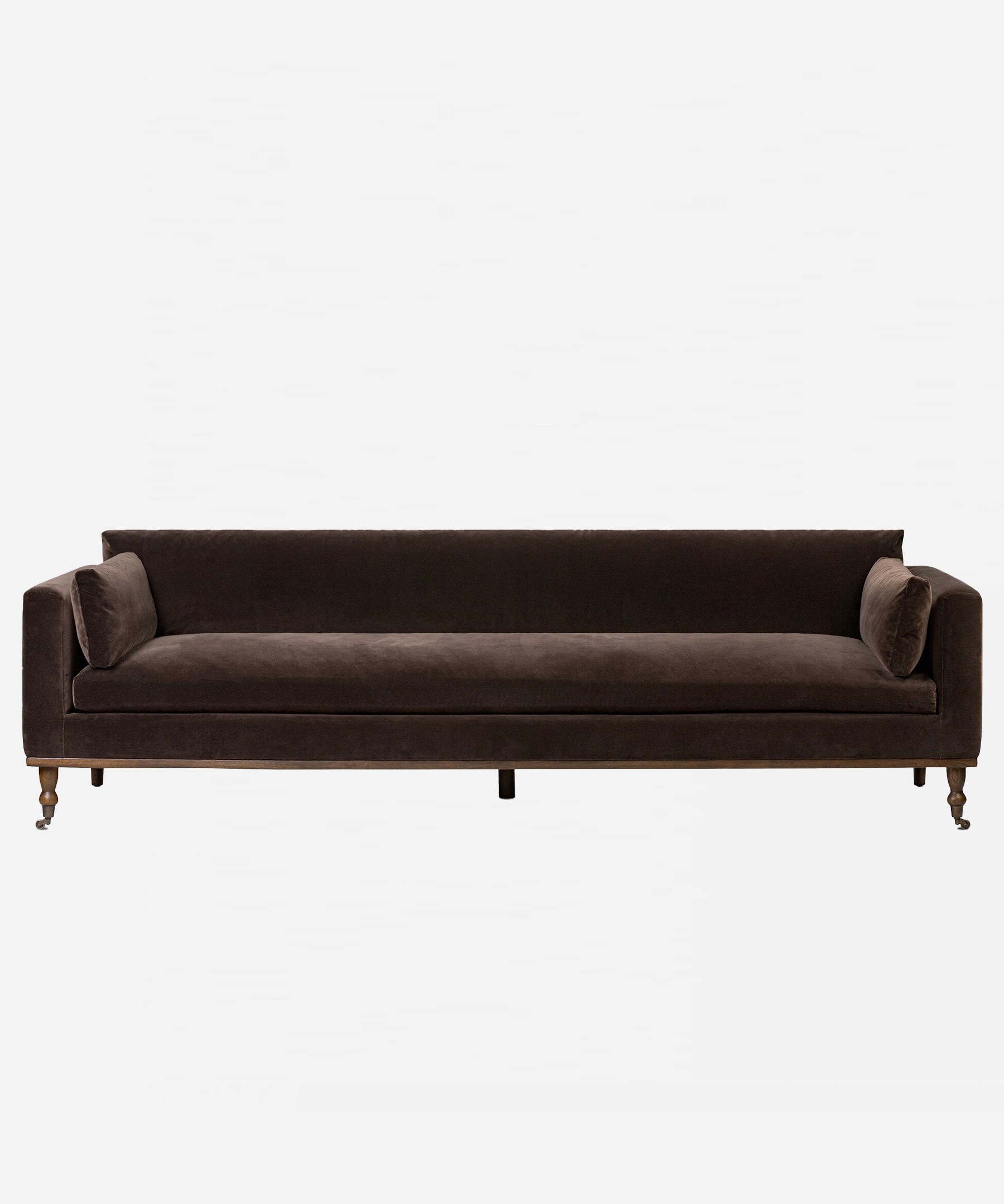 The Althea Sofa seamlessly blends mid-century modern aesthetics with vintage charm. Supported by turned oak legs and brass casters, this low-profile design invites relaxation with its generous bench seat. Rich chocolate-brown velvet upholstery drapes the knife-edge back and boxed arm cushions, while refined details create an understated statement piece.
