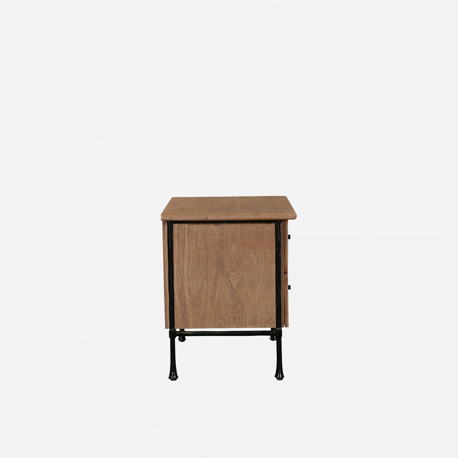 The Axel nightstand effortlessly fuses traditional charm with modern sophistication. Its beveled feet and mixed-material design showcase solid wood with a wire-brushed finish that highlights the grain, set atop hammered iron legs for a subtle floating effect. Thoughtful details, from precise wood joinery to contrasting iron handles underscore its meticulous craftsmanship.