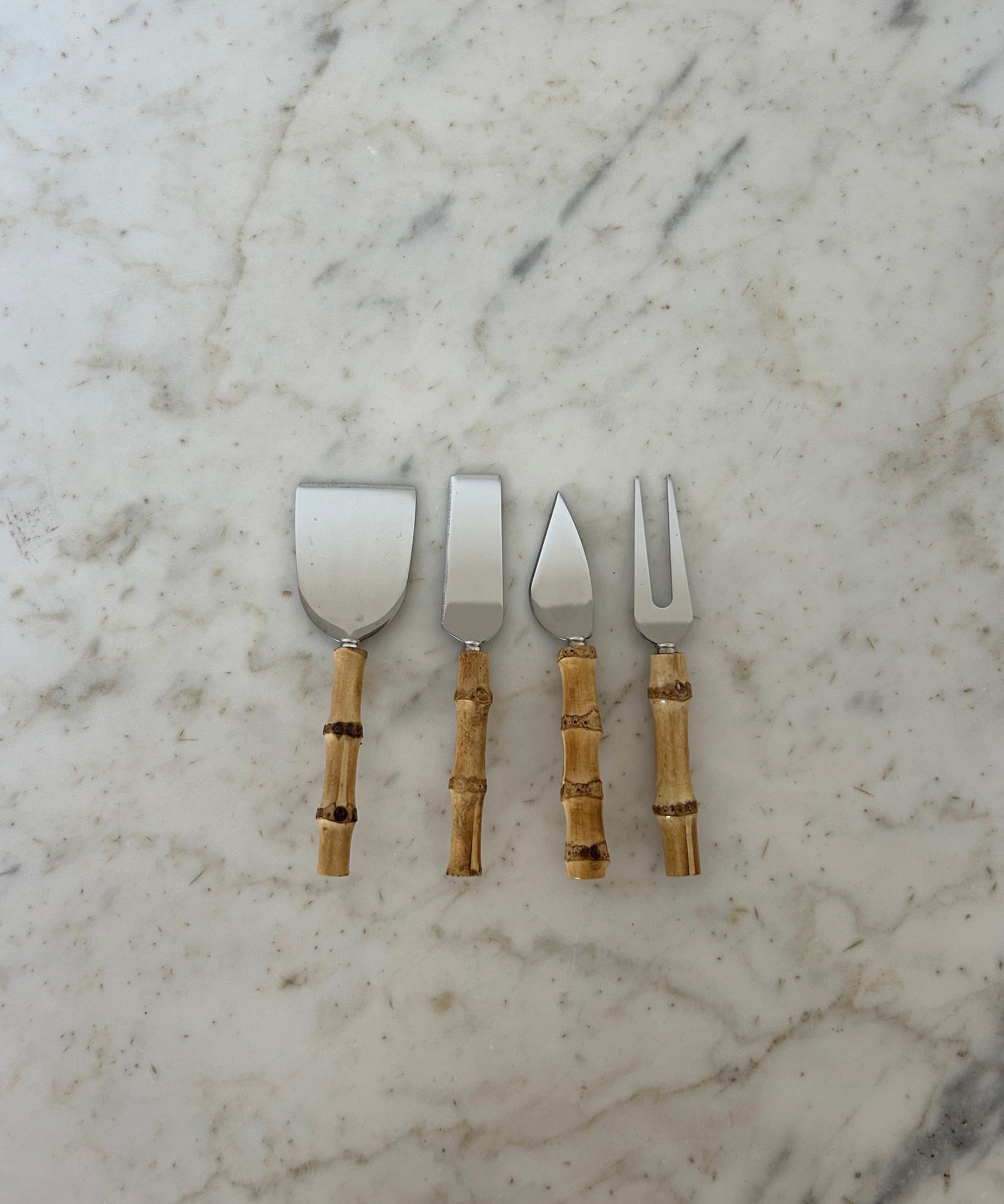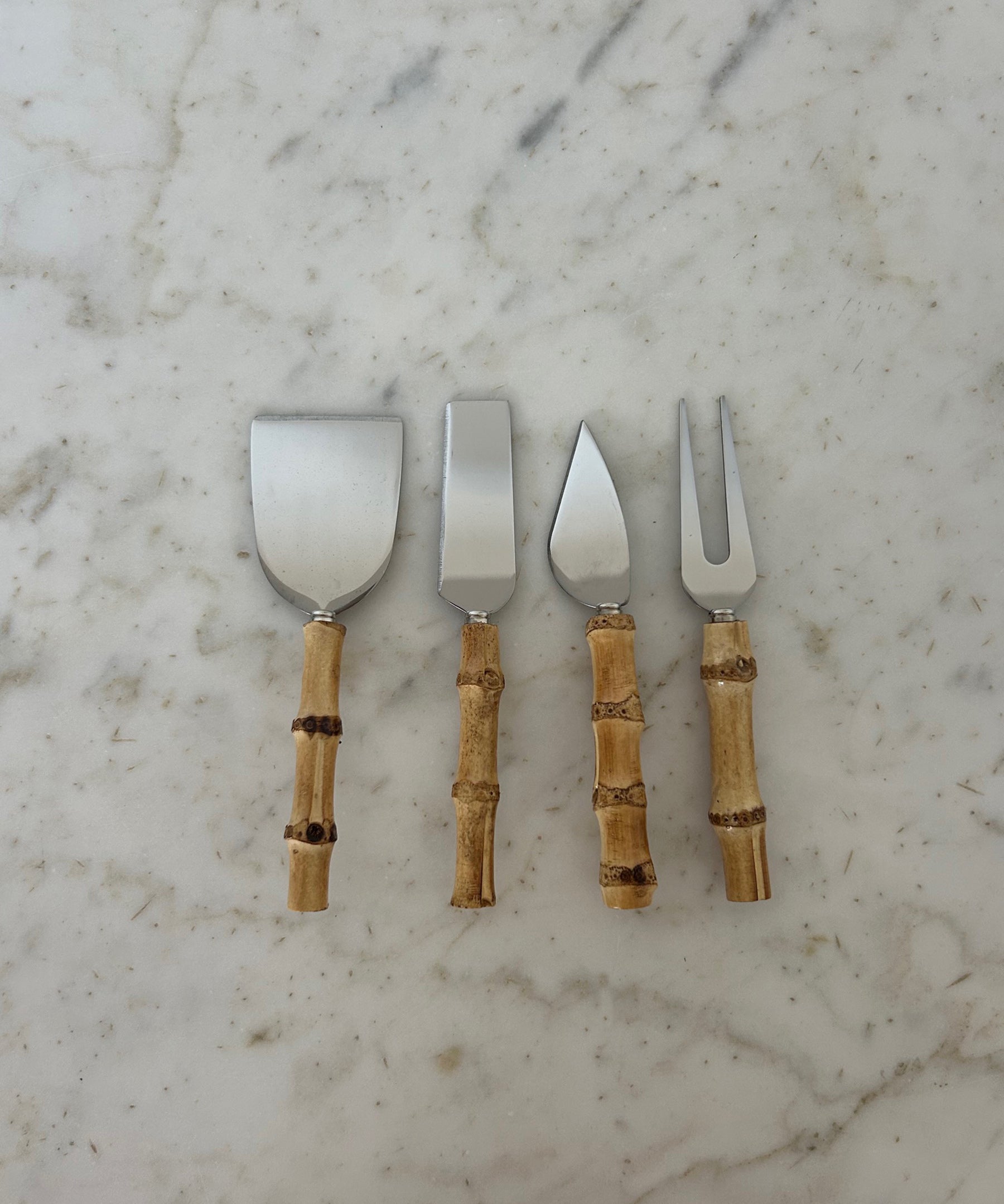 Elevate your cheese board presentation with this refined four-piece set, expertly crafted to handle every cutting and serving need. Each tool features a premium stainless steel blade paired with a warm bamboo handle, combining durability with natural elegance. The collection includes a precision cheese knife, delicate fork, smooth slicer, and versatile spreader. Perfect for entertaining or everyday indulgence, this set transforms cheese service into an art form.