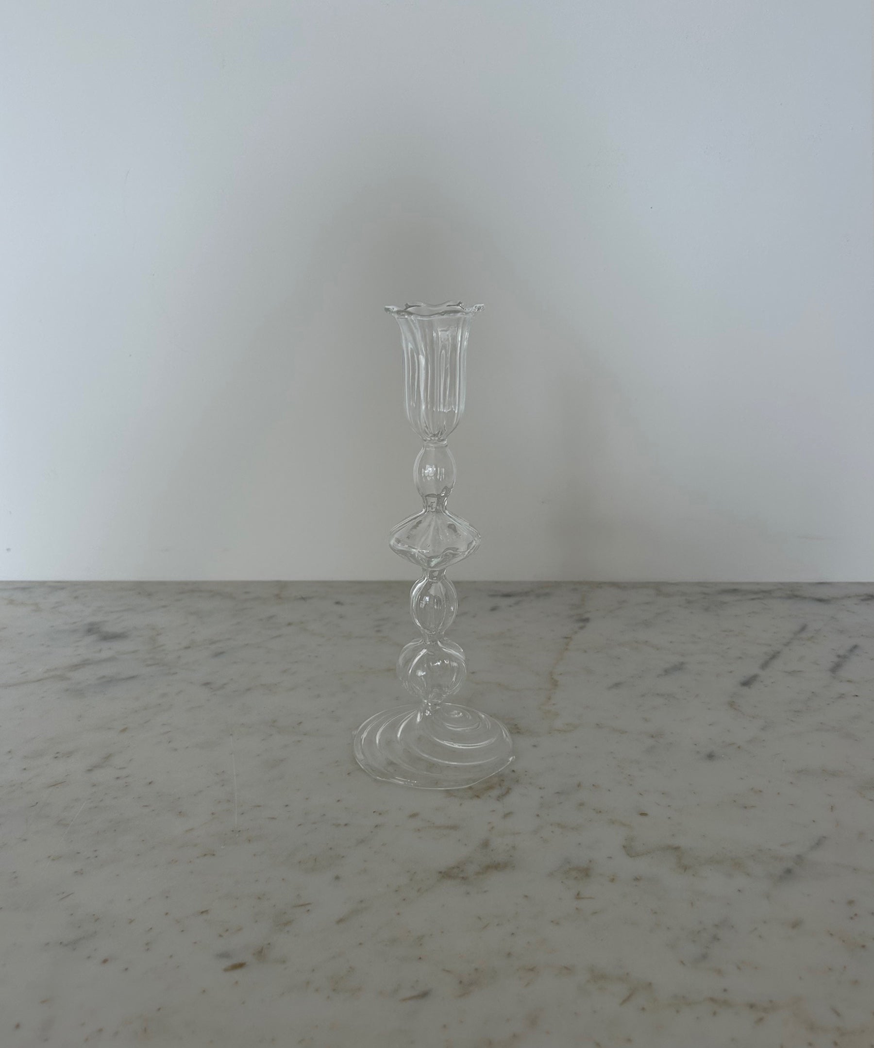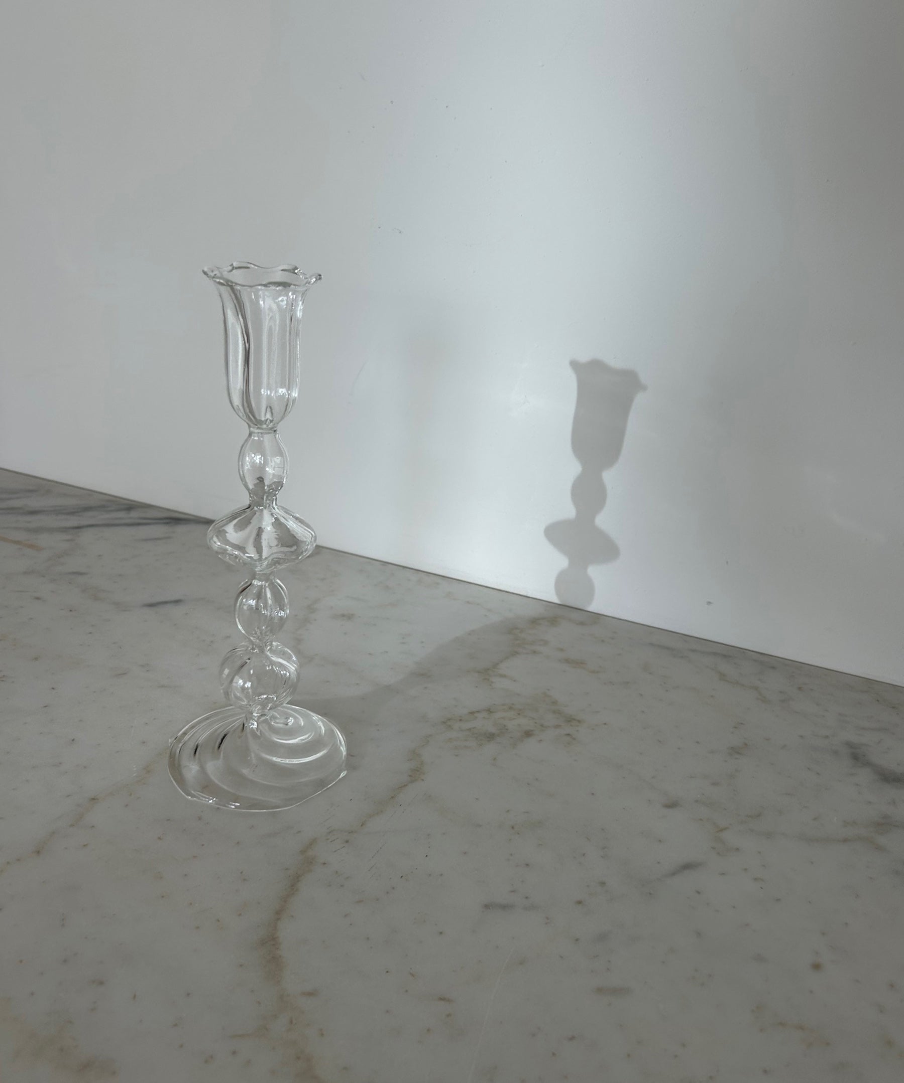 Elevate your space with this exquisite blown glass candle holder. Its elegant craftsmanship highlights delicate curves and transparency, creating a refined ambiance as it gently diffuses candlelight. Perfect for adding a touch of sophistication to any setting, this piece blends artistry with function for a timeless decor accent.