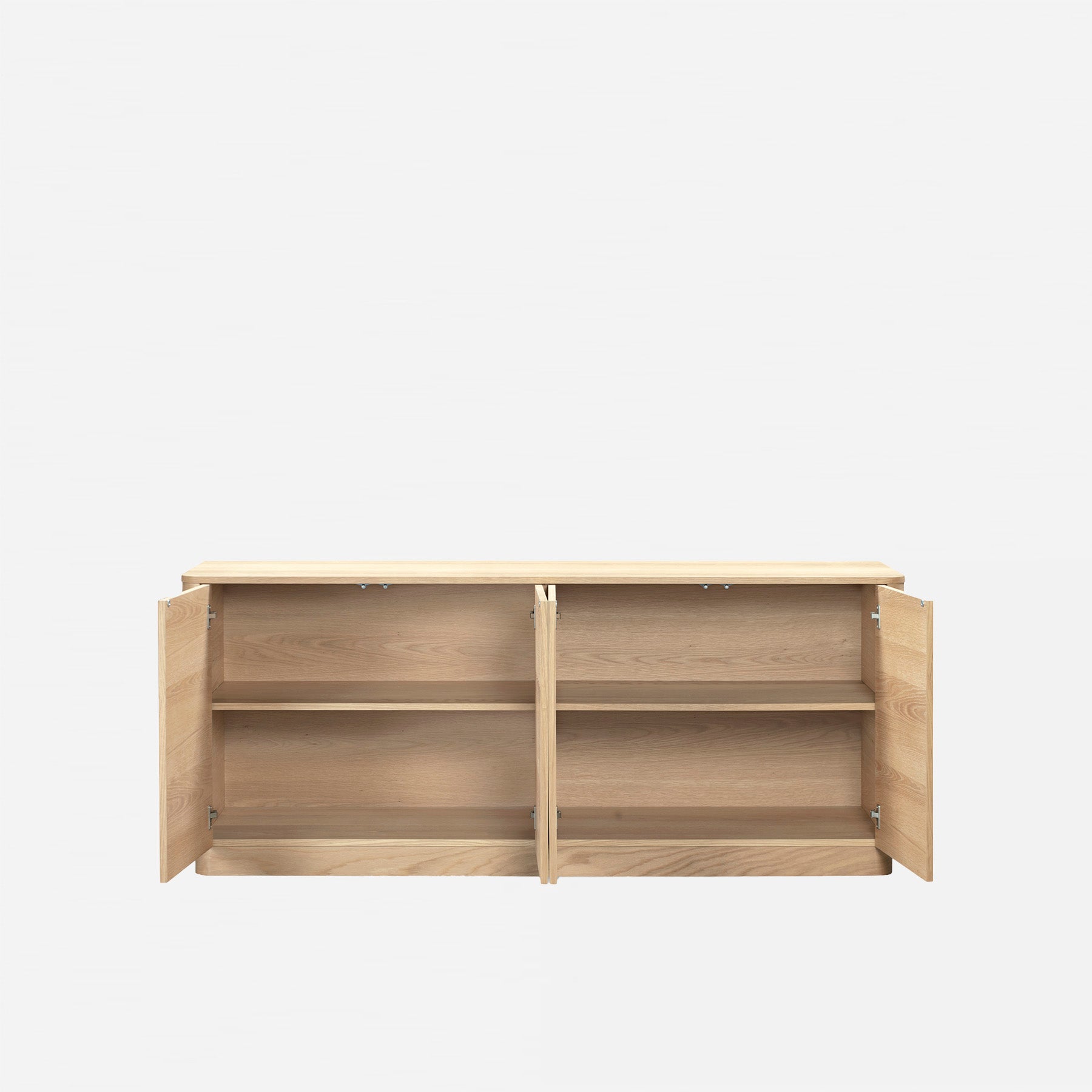 Softened edges, serene design. The Brynn Sideboard blends Scandinavian simplicity with gentle curves and a light oak finish. The natural wood-grain veneer rests on a solid rubberwood base, creating a calming, grounded presence. Four seamless doors reveal generous storage, proving minimalism can be both elegant and practical. A perfect balance of structure and softness, it’s where natural beauty meets effortless everyday living.