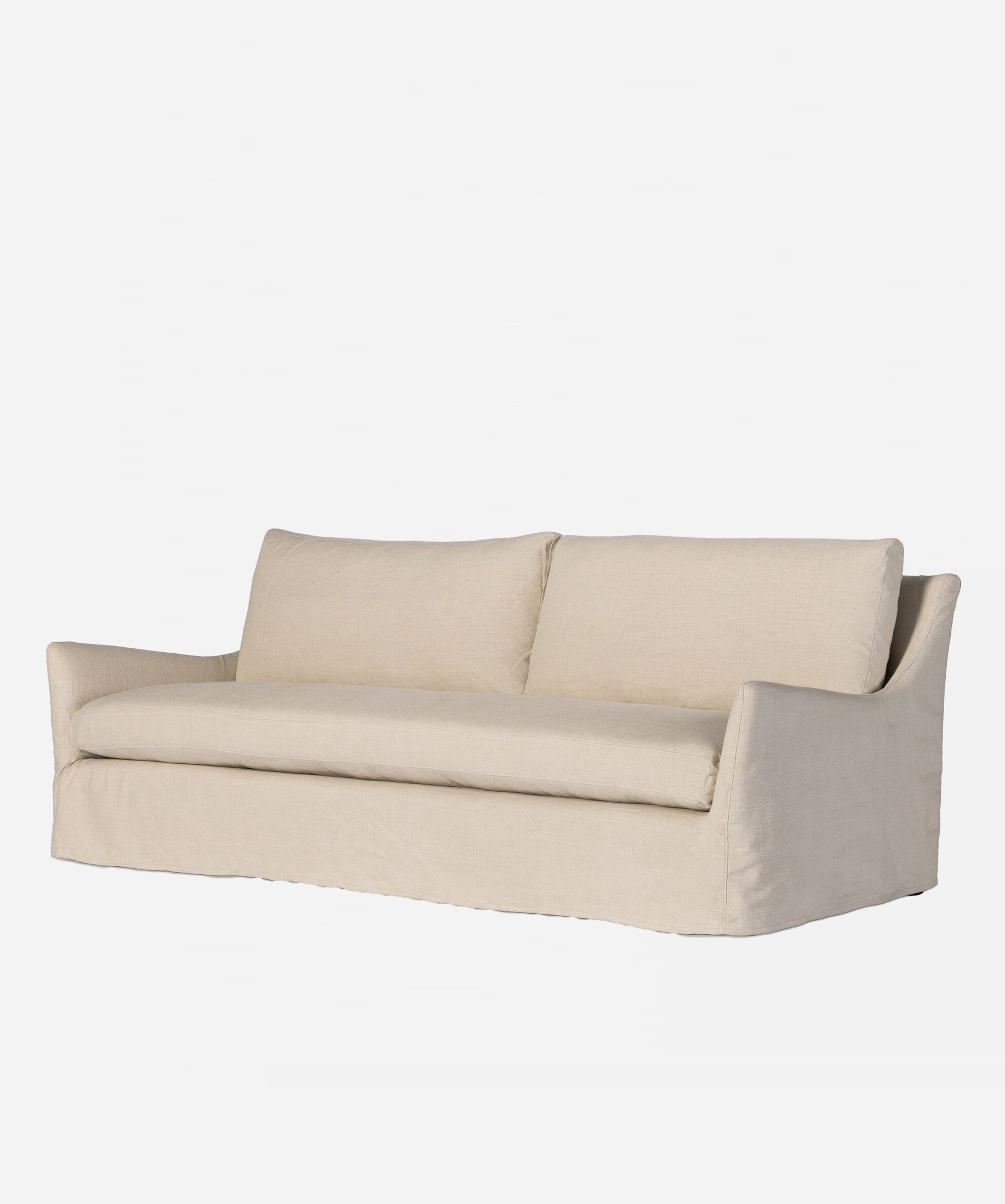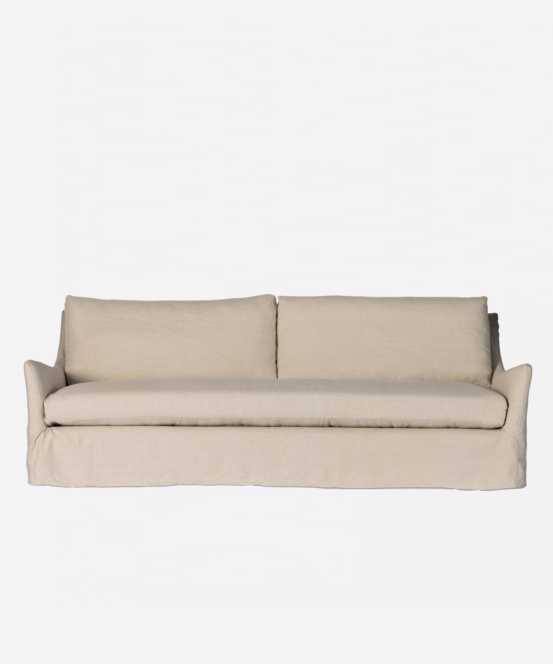 The Caelia Slipcover Sofa combines timeless elegance with practical luxury. Featuring gently sloped, flared arms and a graceful floor-length silhouette, this piece brings refined sophistication to any living space. Crafted from artisan-made Belgian linens, a soft, tightly woven fabric free of toxic chemicals. With a fully removable, machine-washable slipcover this sofa offers effortless maintenance, allowing you to keep your investment looking pristine for years to come. A perfect balance of traditional style and modern convenience.