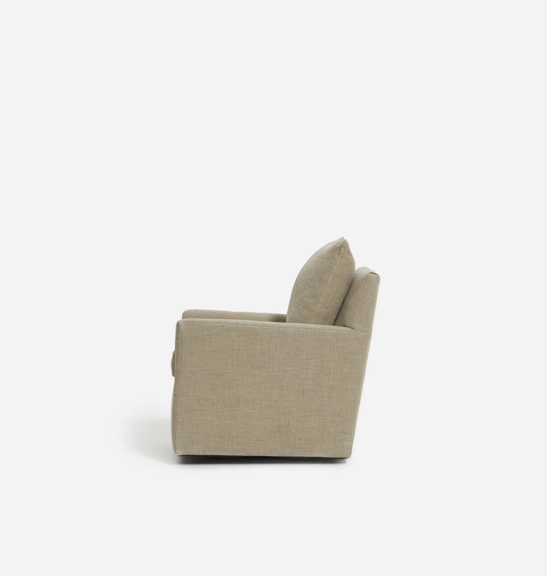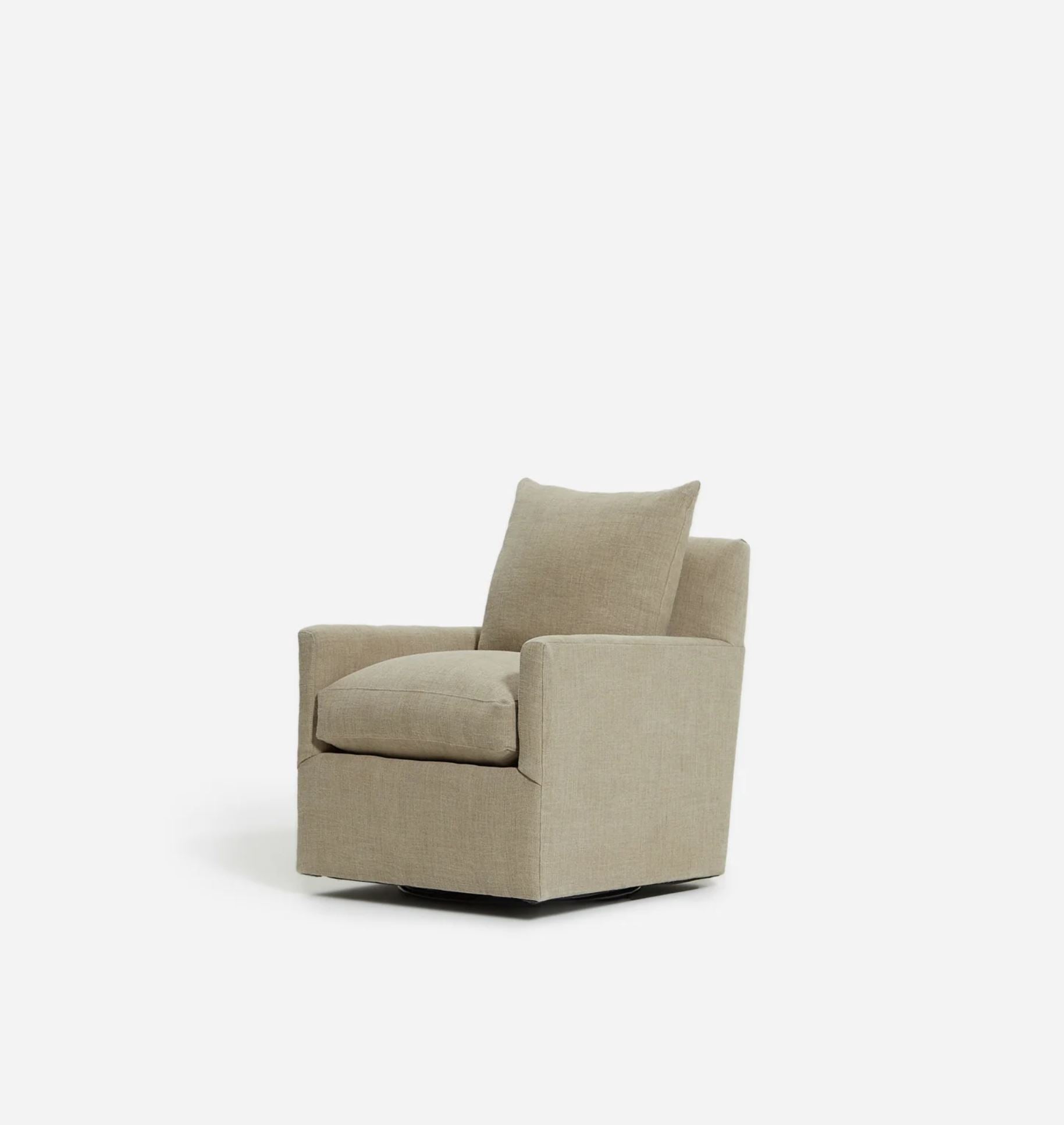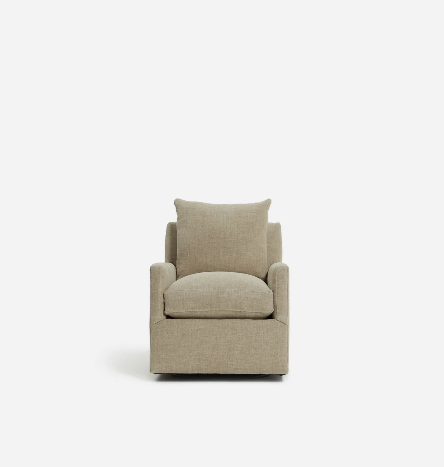 Experience elevated comfort with the Camille Swivel Glider Chair and Ottoman. Upholstered in 100% linen and designed with timeless appeal, the chair combines effortless style with practical function, featuring a smooth swiveling and gliding base. Ideal for unwinding, this versatile pair enhances any refined living space. Please note: chair and ottoman are sold separately.