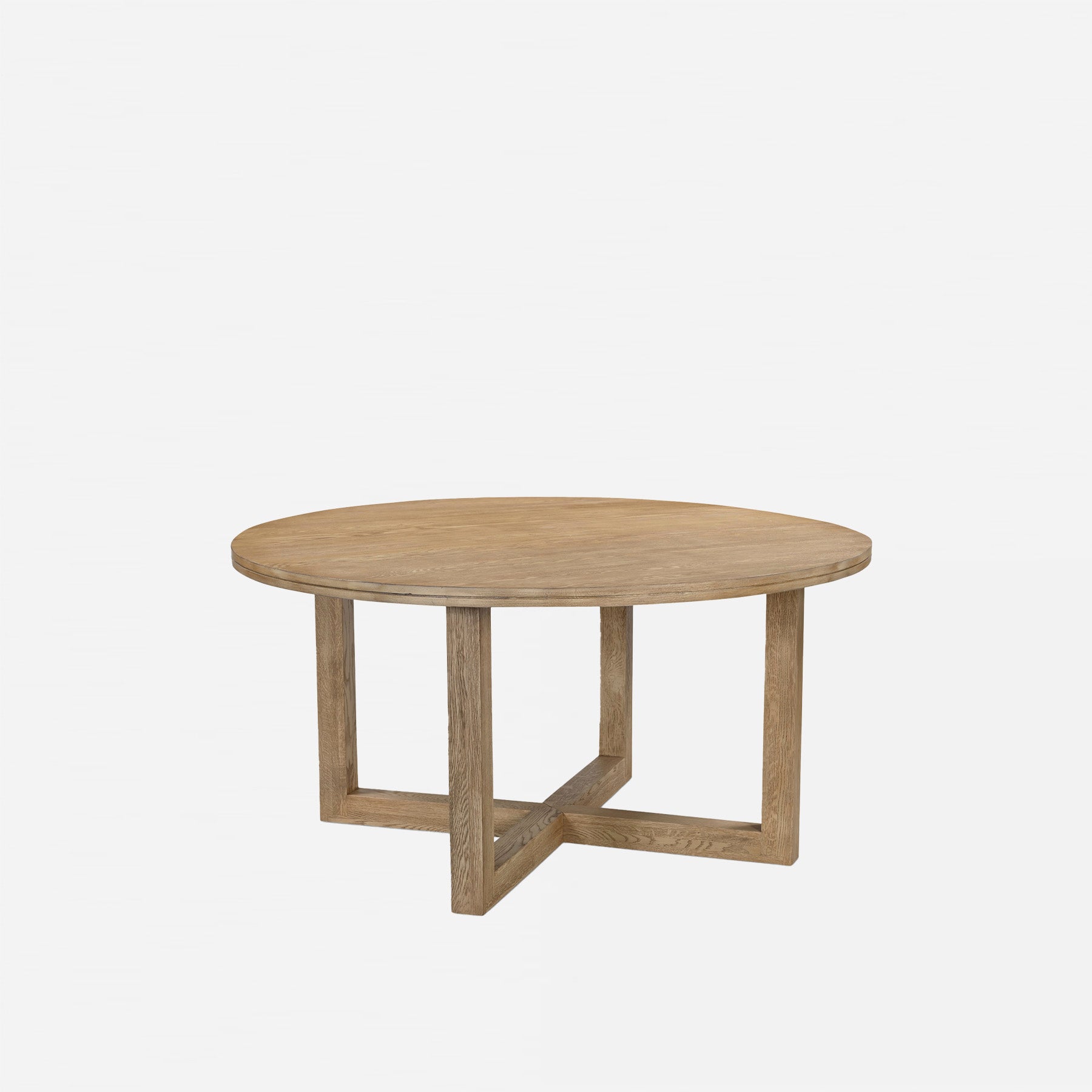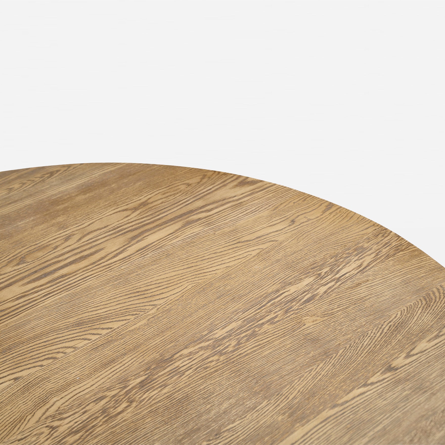 The Celeste Dining Table features a solid oak round top with a subtle V-groove, lending visual lightness to its substantial surface. Its geometric base, accented with crisscrossing stretchers, provides stability and presence. A natural, wire-brushed finish highlights the oak’s organic beauty, creating an elegant centerpiece of refined simplicity.