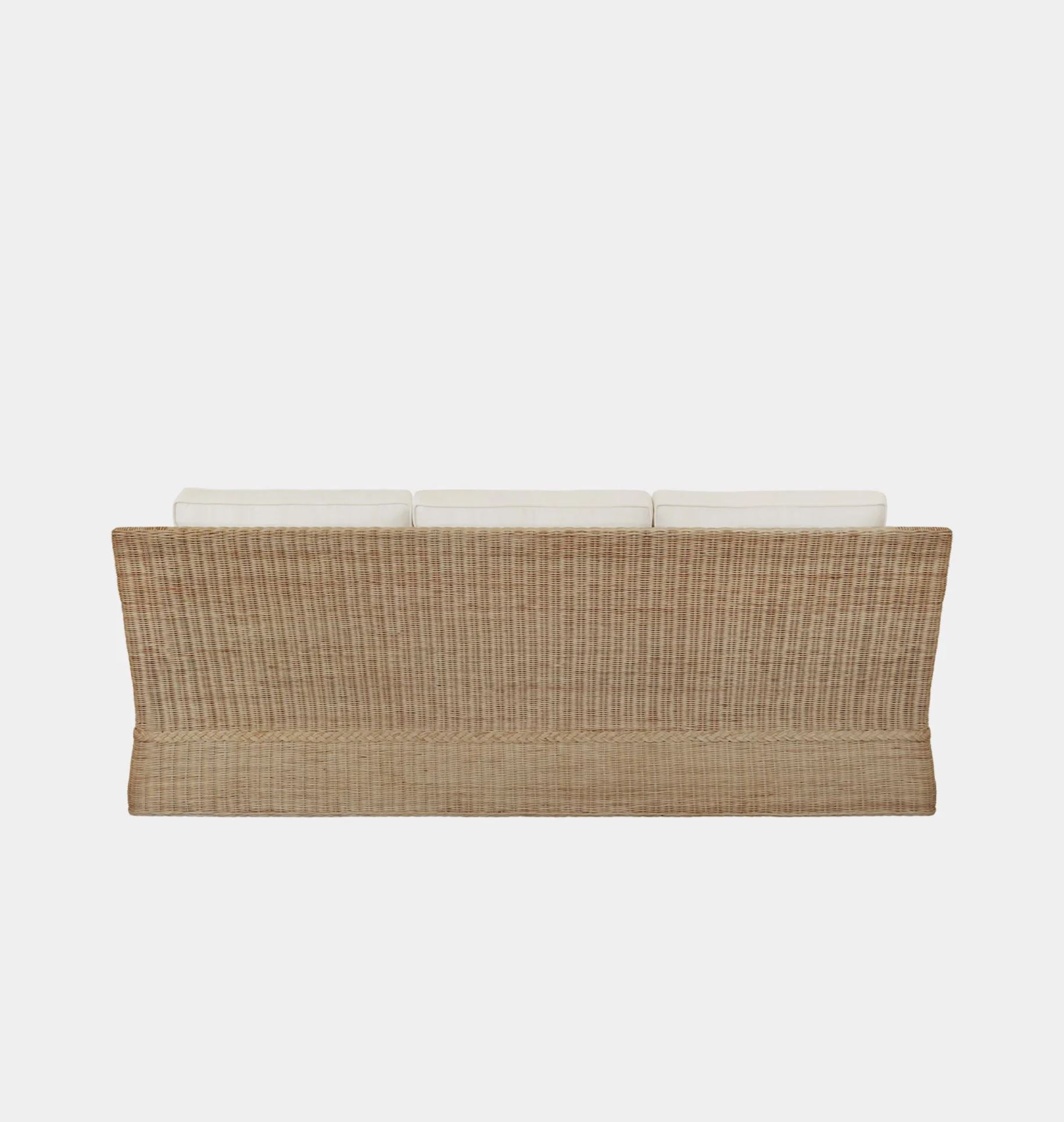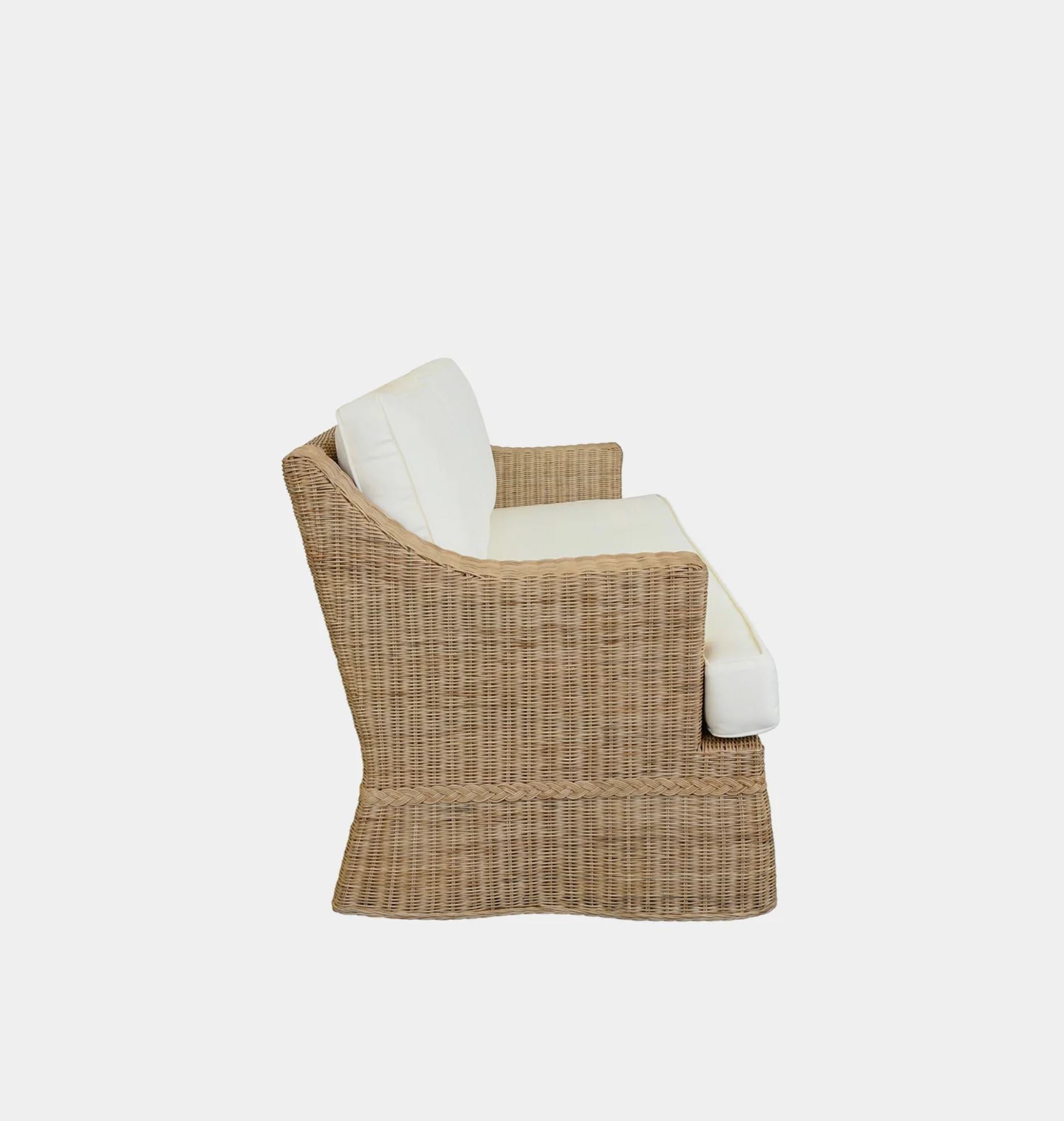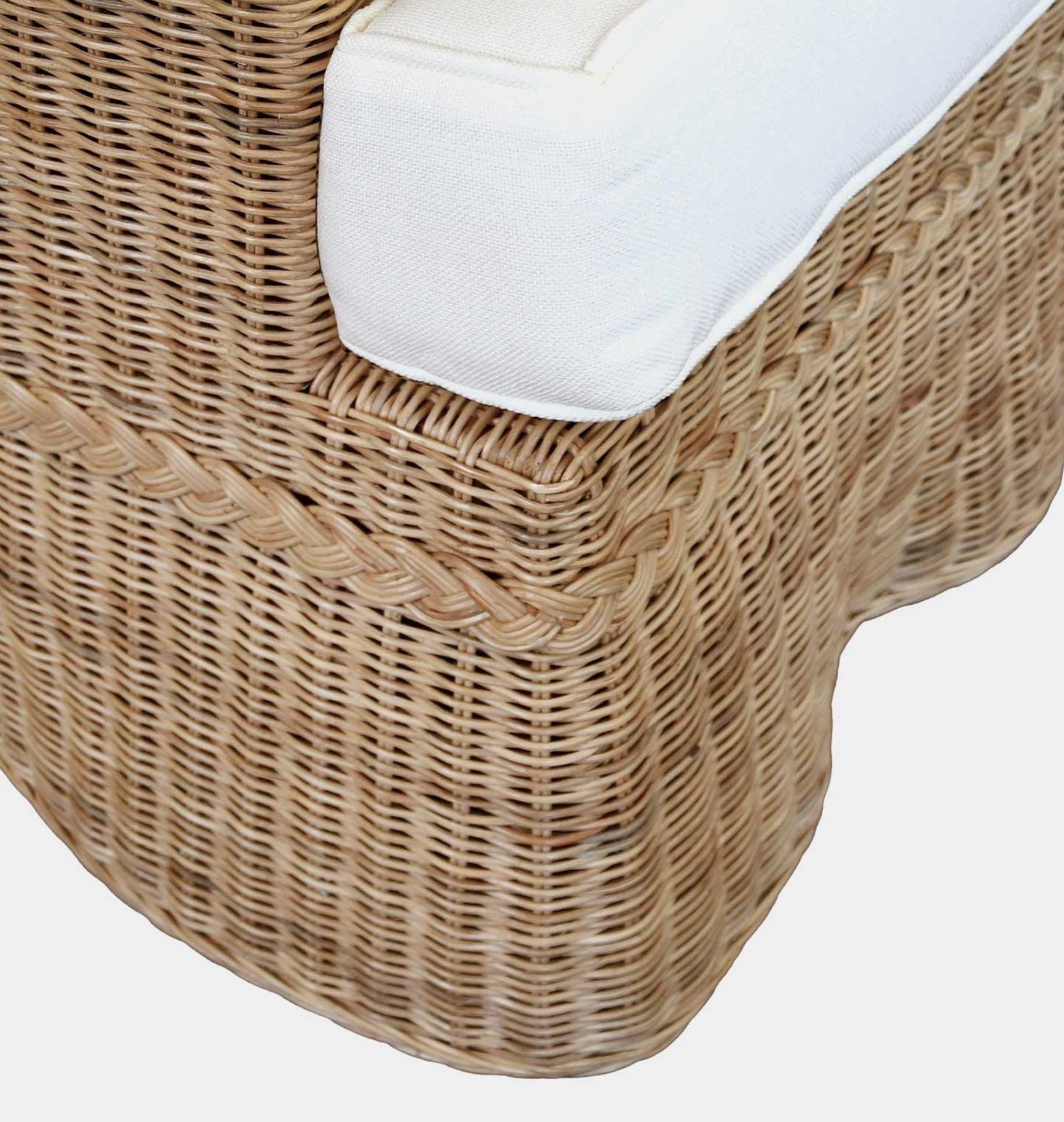 The Corvia Sofa blends the classic refinement of a Lawson-style design with the natural charm of rattan and a gracefully scalloped skirt. Its sumptuous ivory linen cushions offer exceptional comfort and understated elegance. Make a statement in your living space with this distinctive and sophisticated piece.