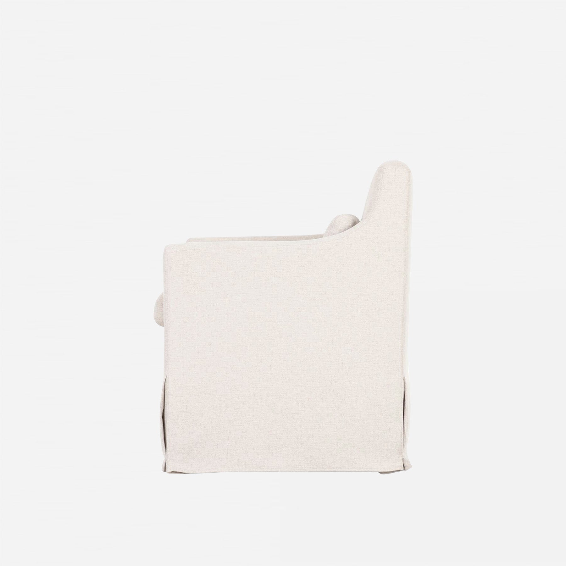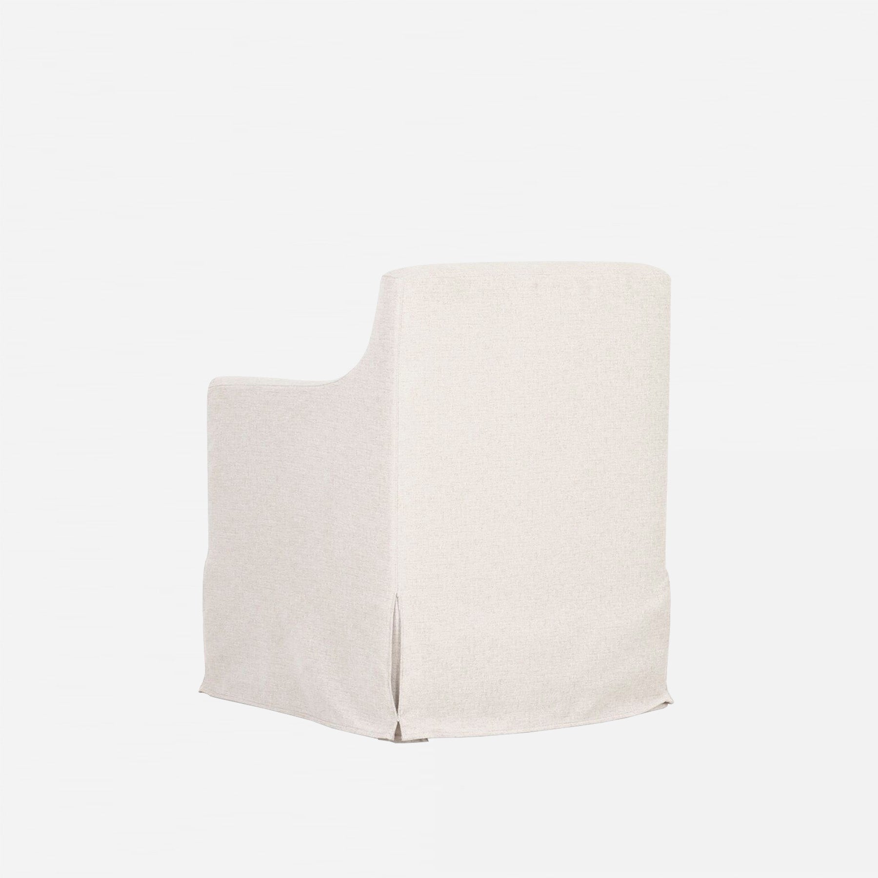 The Corvin Slipcover Dining Chair embodies traditional style with gracefully curved armrests and a neatly tailored, washable slipcover with inverted pleats. It comes with a lumbar pillow for added comfort.