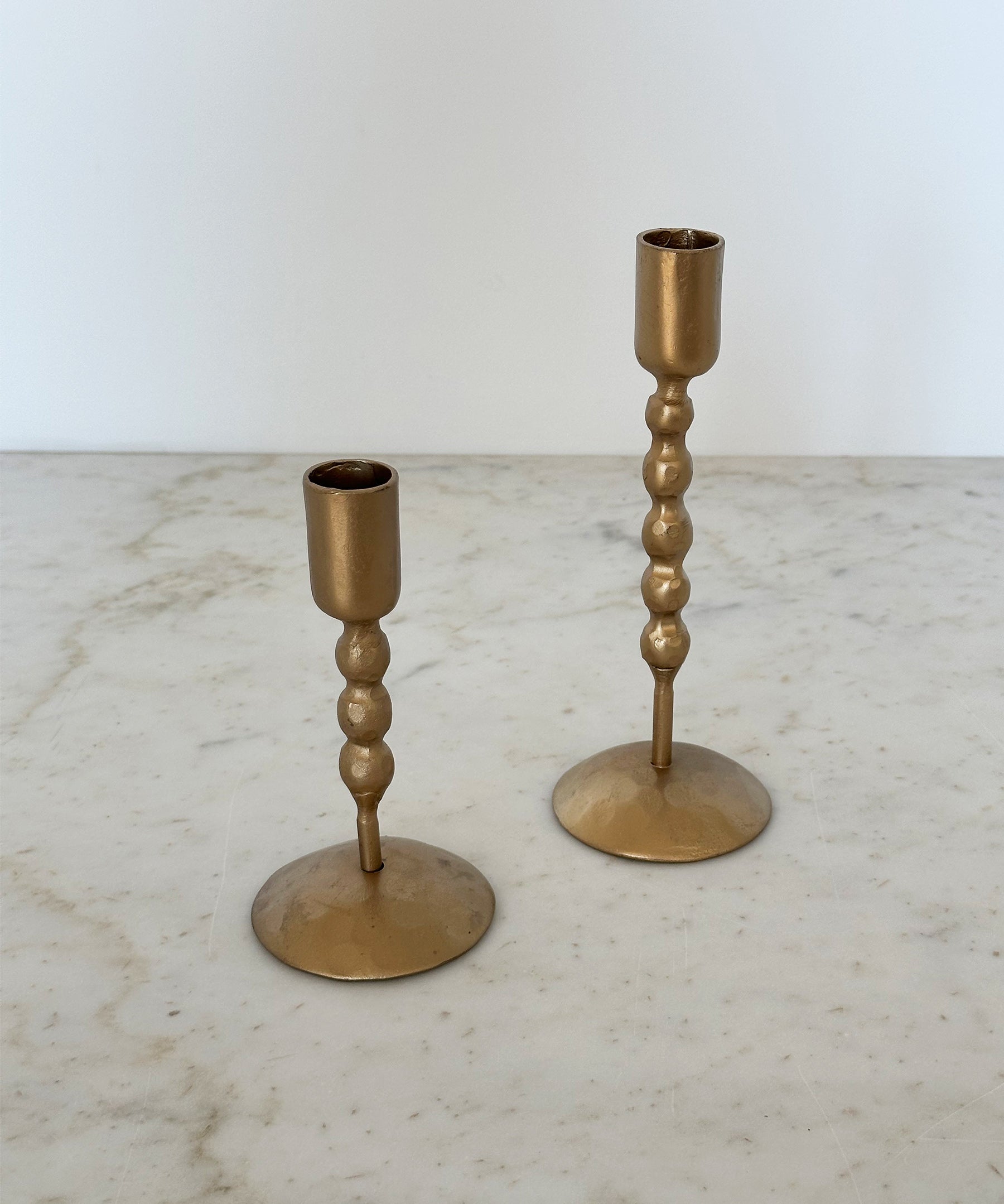 Elevate your décor with this set of two hand-forged iron taper holders featuring an elegant antique brass finish. Their graceful curves and artisanal craftsmanship bring timeless sophistication to any tabletop or mantel, creating an inviting ambiance with style and charm.