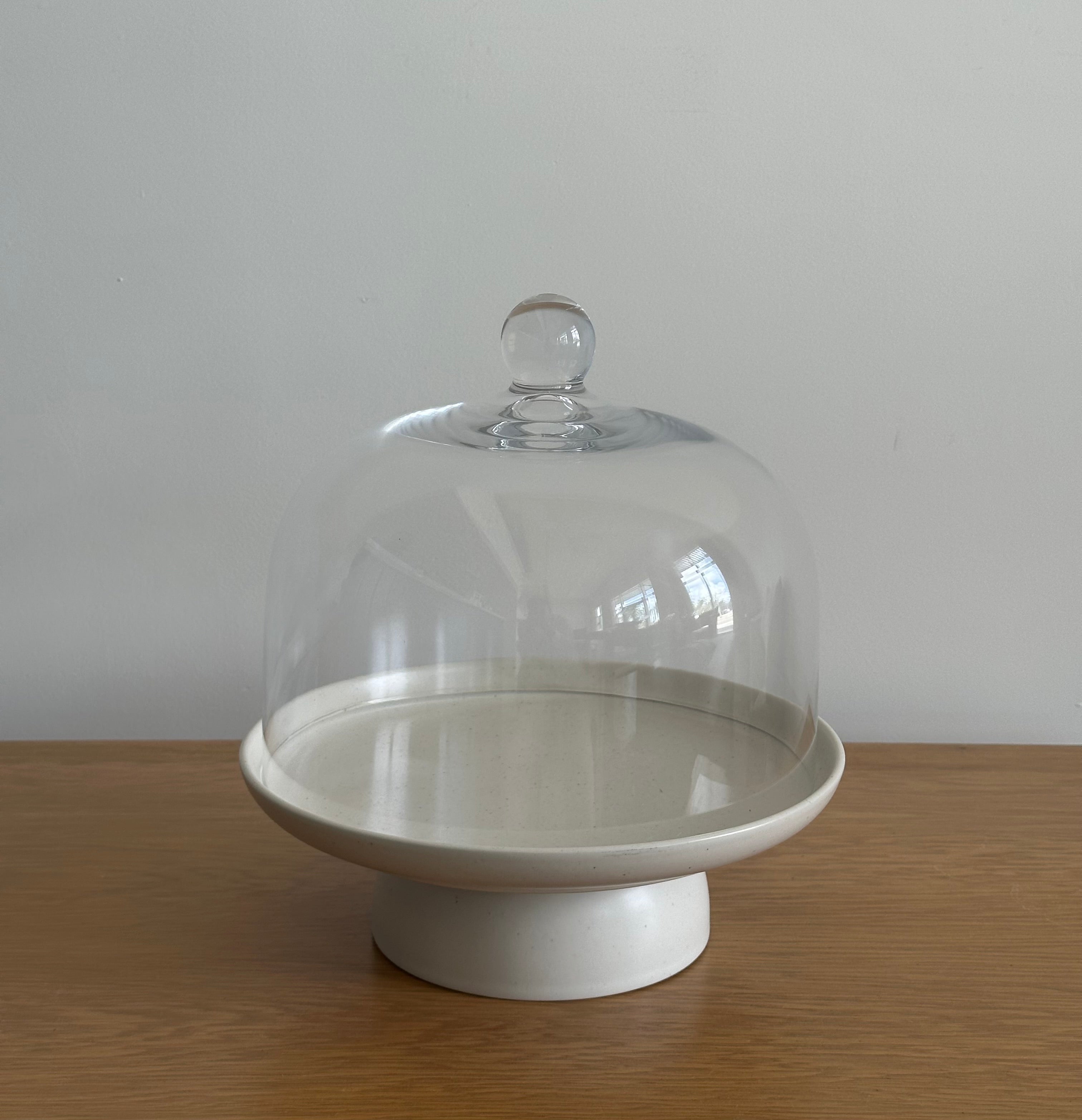 This glass dome is a versatile addition to any home. Use it to cover your footed plate or any serving platter or board to keep your food fresh and protected. Made of clear glass, it showcases your food while preserving its flavors. A must-have for any serveware collection.