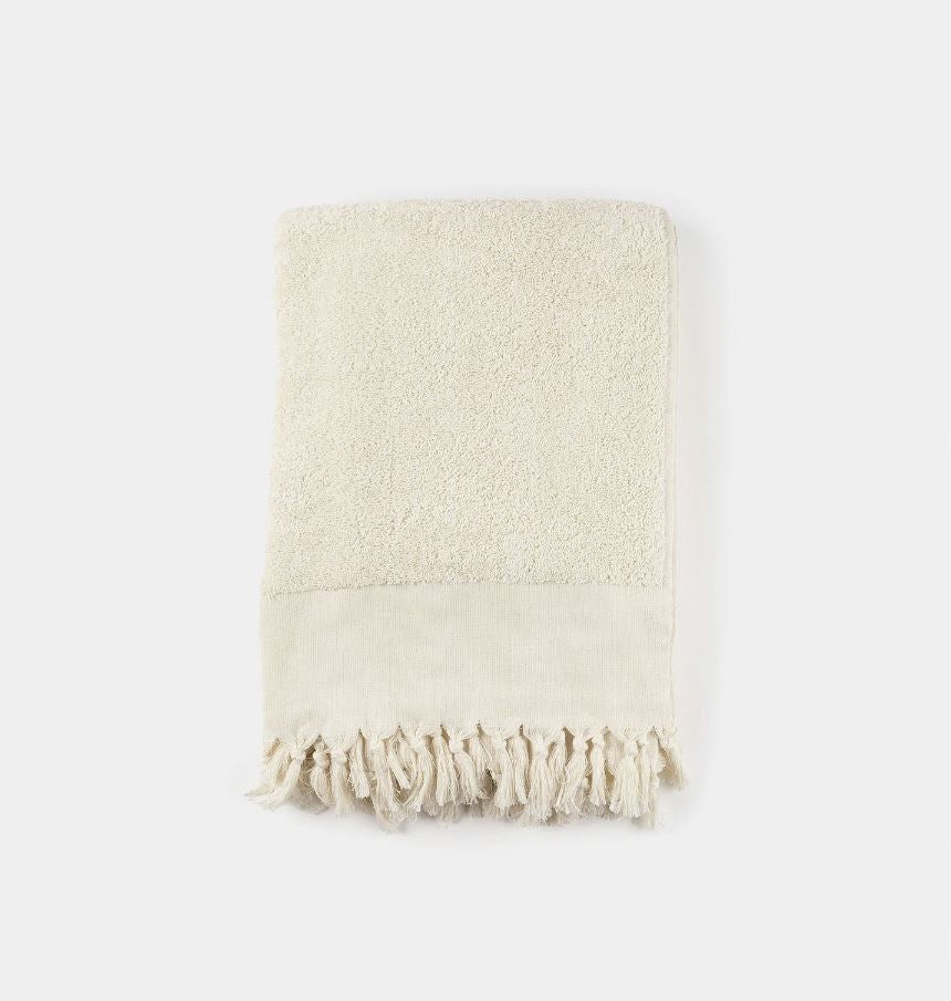 The cotton Terry Towels were woven in the small town of Buldan, Turkey in a small atelier run by a family of traditional weavers. Each towel is made from ethically produced high-quality Turkish cotton, using traditional techniques for processing, refining and looming. The cotton yards are free of synthetic dyes, warped on authentic looms in small workshops and woven with great care by skilled weavers. They are then finished by hand with a beautiful fringe detail by low-income women in Denizli, Turkey's most celebrated textile region.