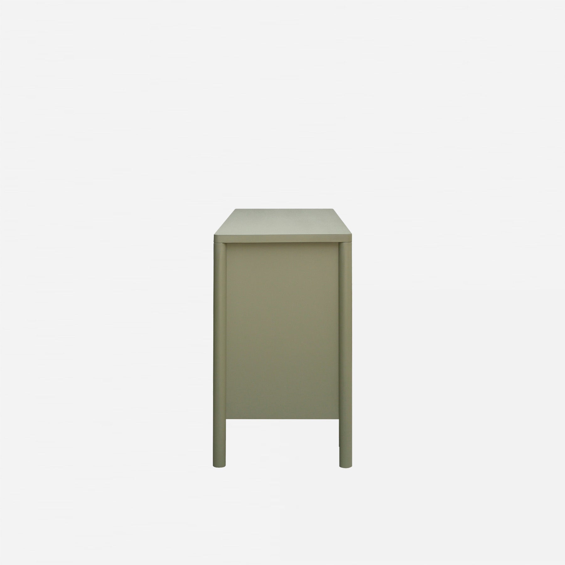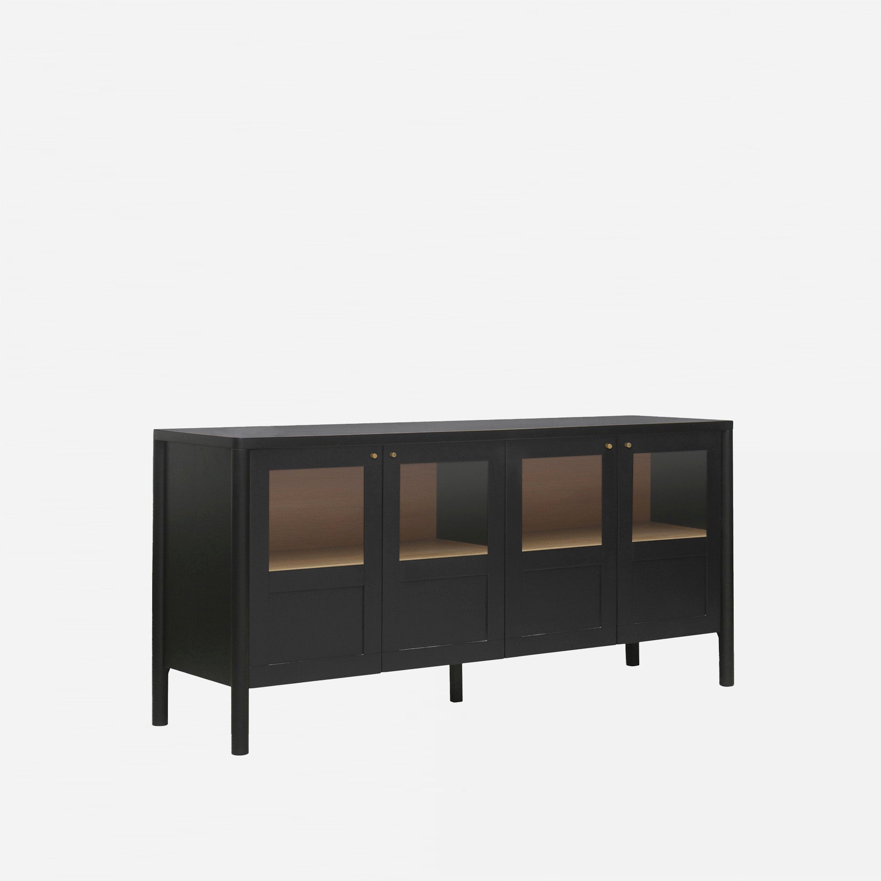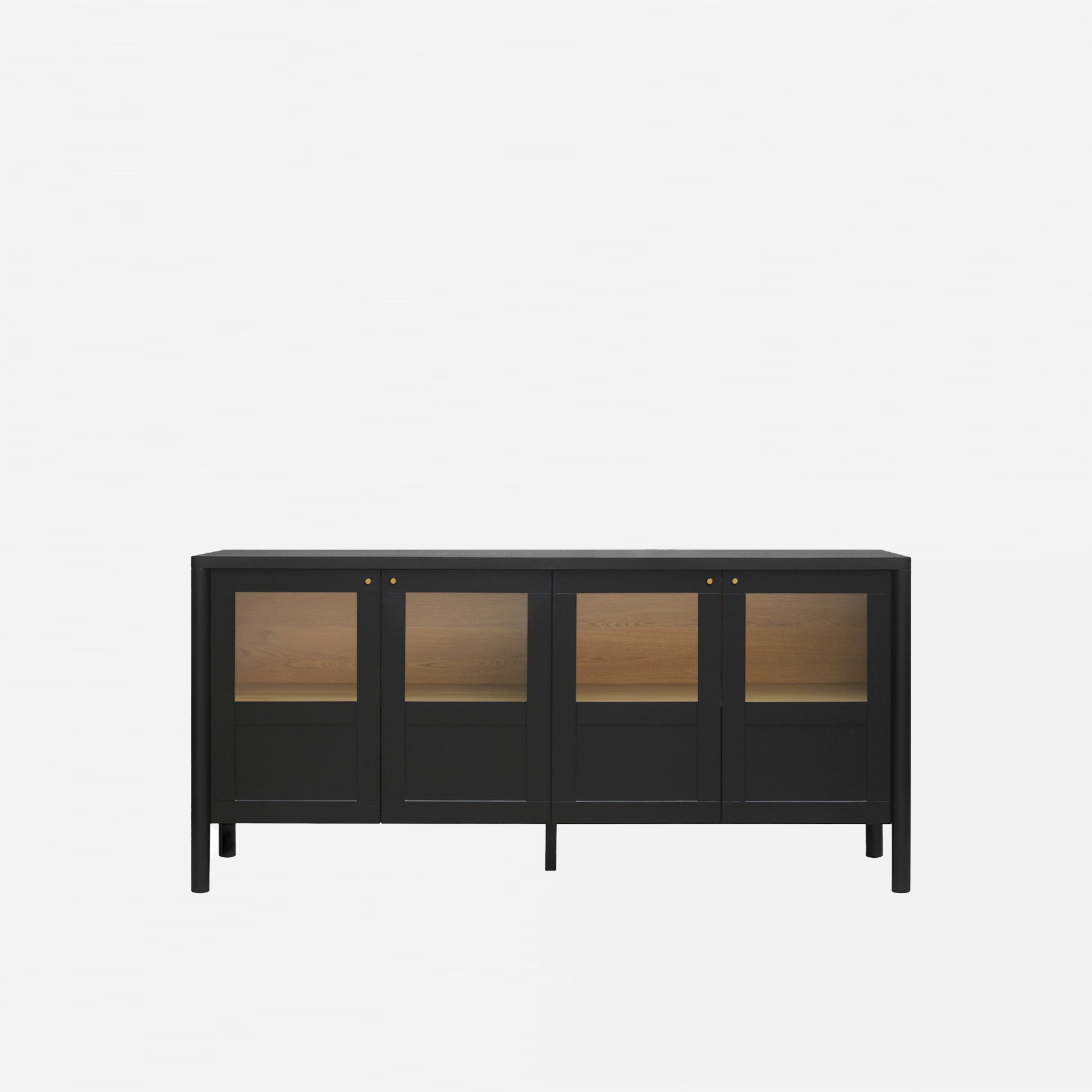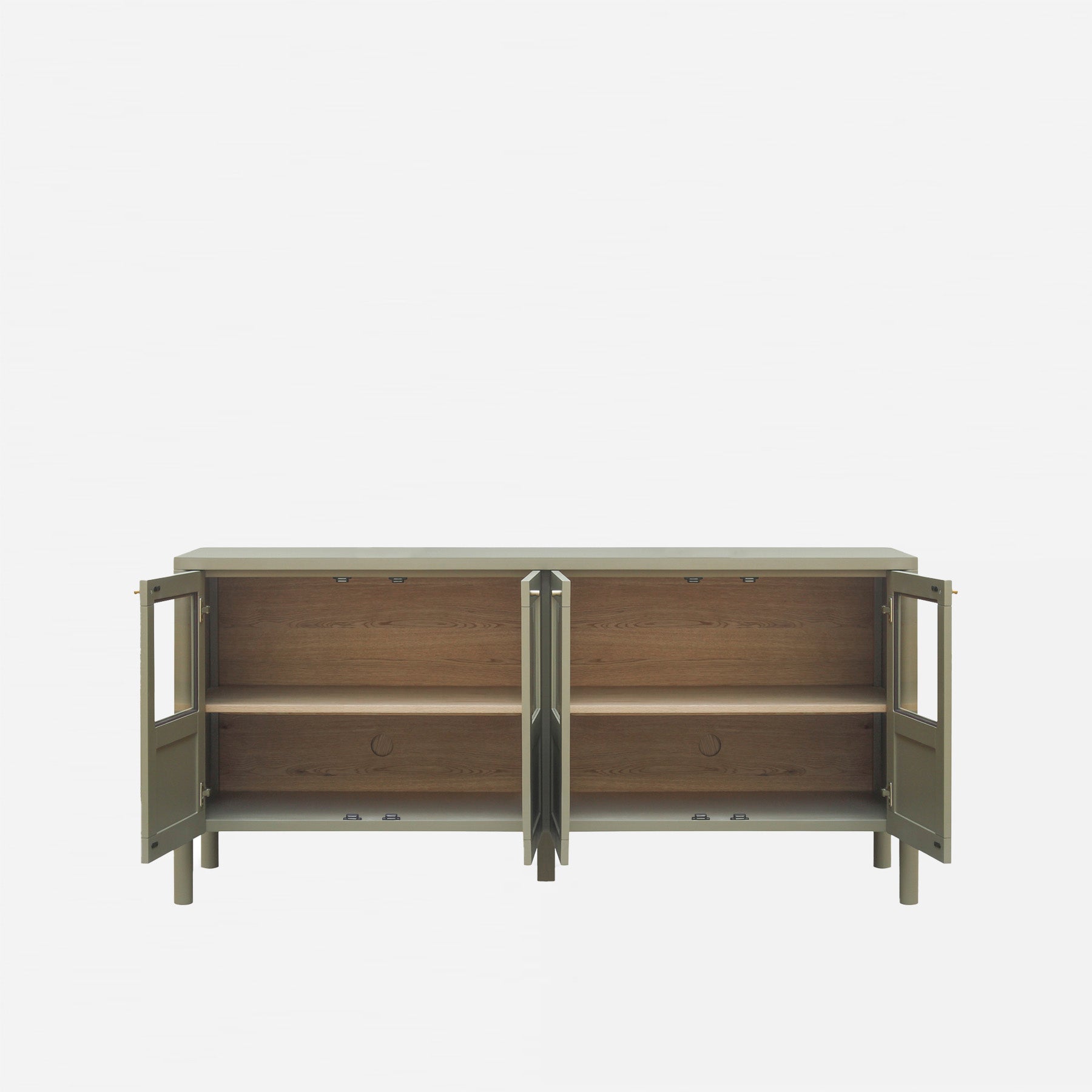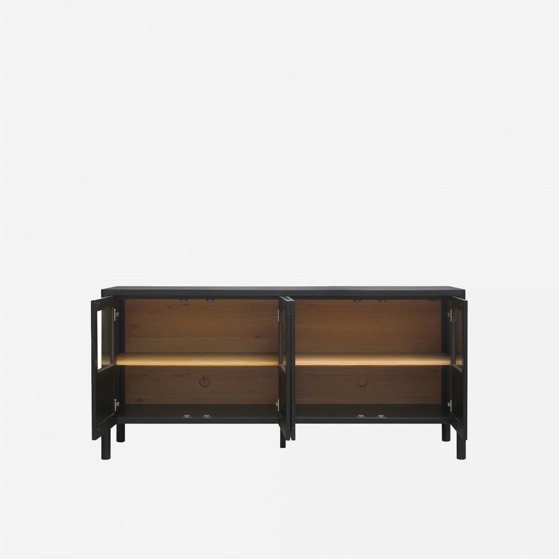 Inspired by classic cabinetry, the Harland Sideboard harmonizes openness and privacy with a mix of glass and solid panels. Crafted from a solid pine frame with oak veneer accents, it’s elevated on slender dowel legs and finished with understated bronze hardware for a timeless, balanced look.