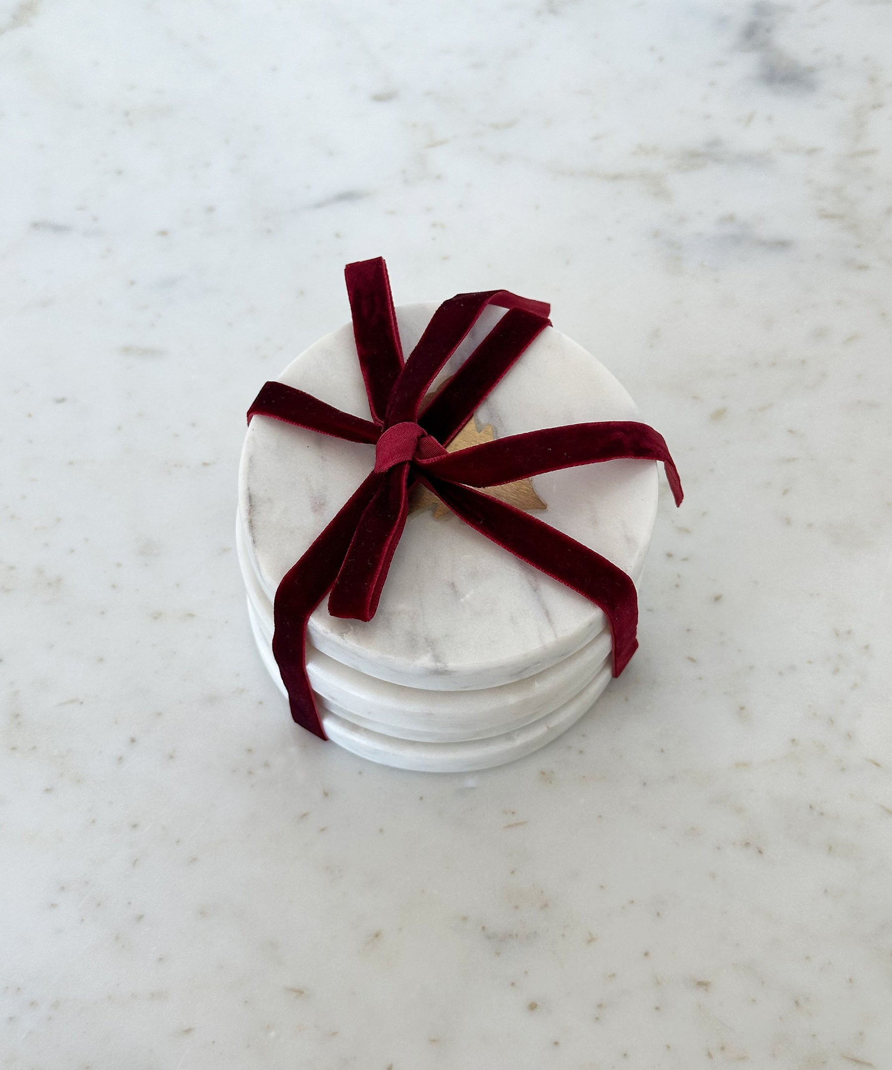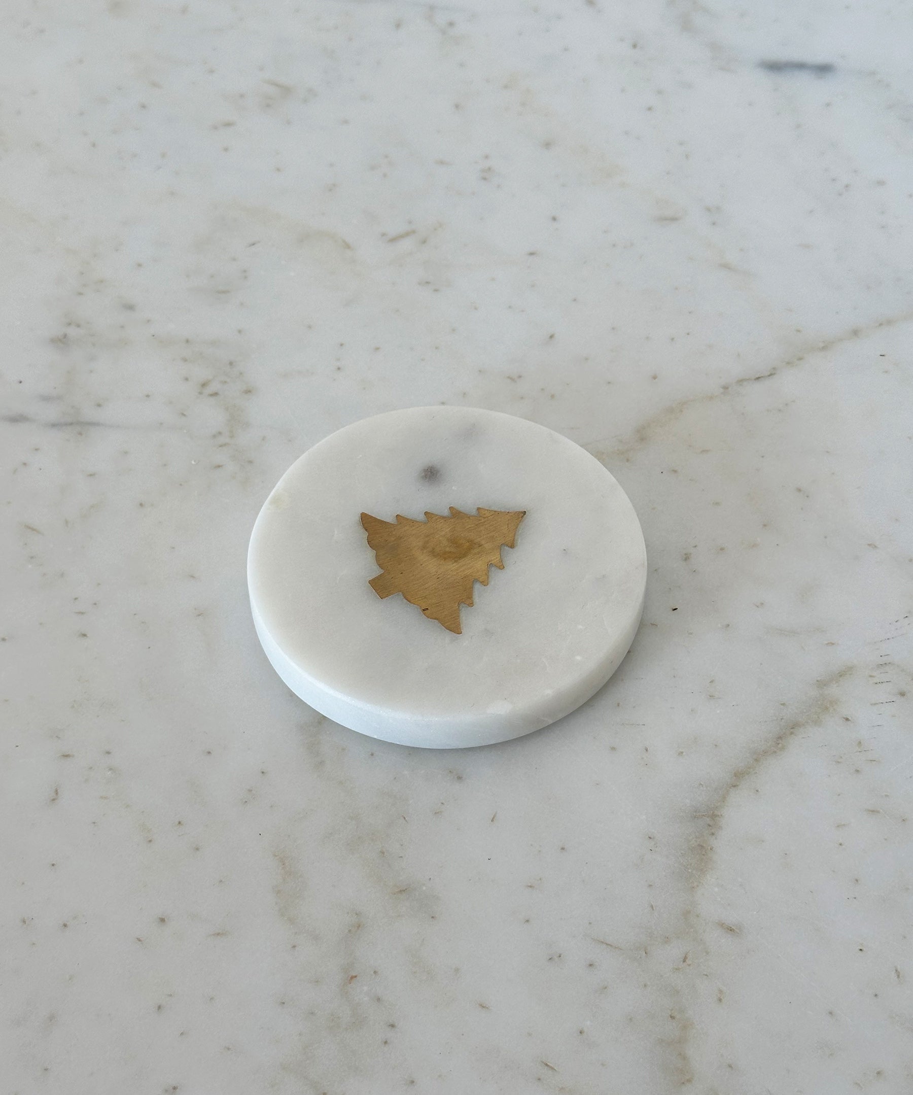 Elevate your holiday gatherings with this elegant set of four marble coasters, each featuring a refined brass tree inlay at the center. Crafted for both style and durability, these coasters protect surfaces while adding a touch of festive sophistication to any space. Perfect for gifting or holiday entertaining, they blend timeless design with seasonal charm.