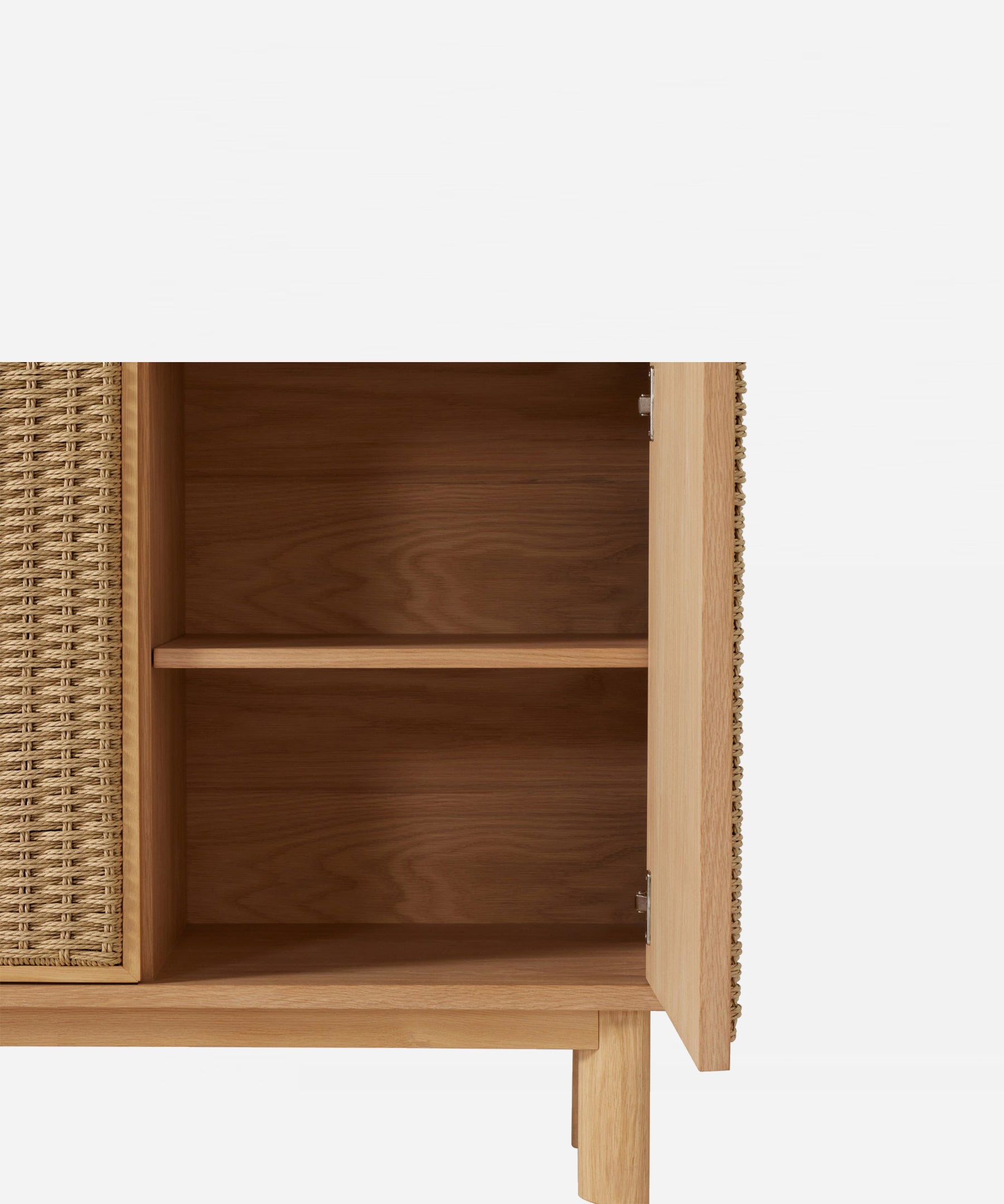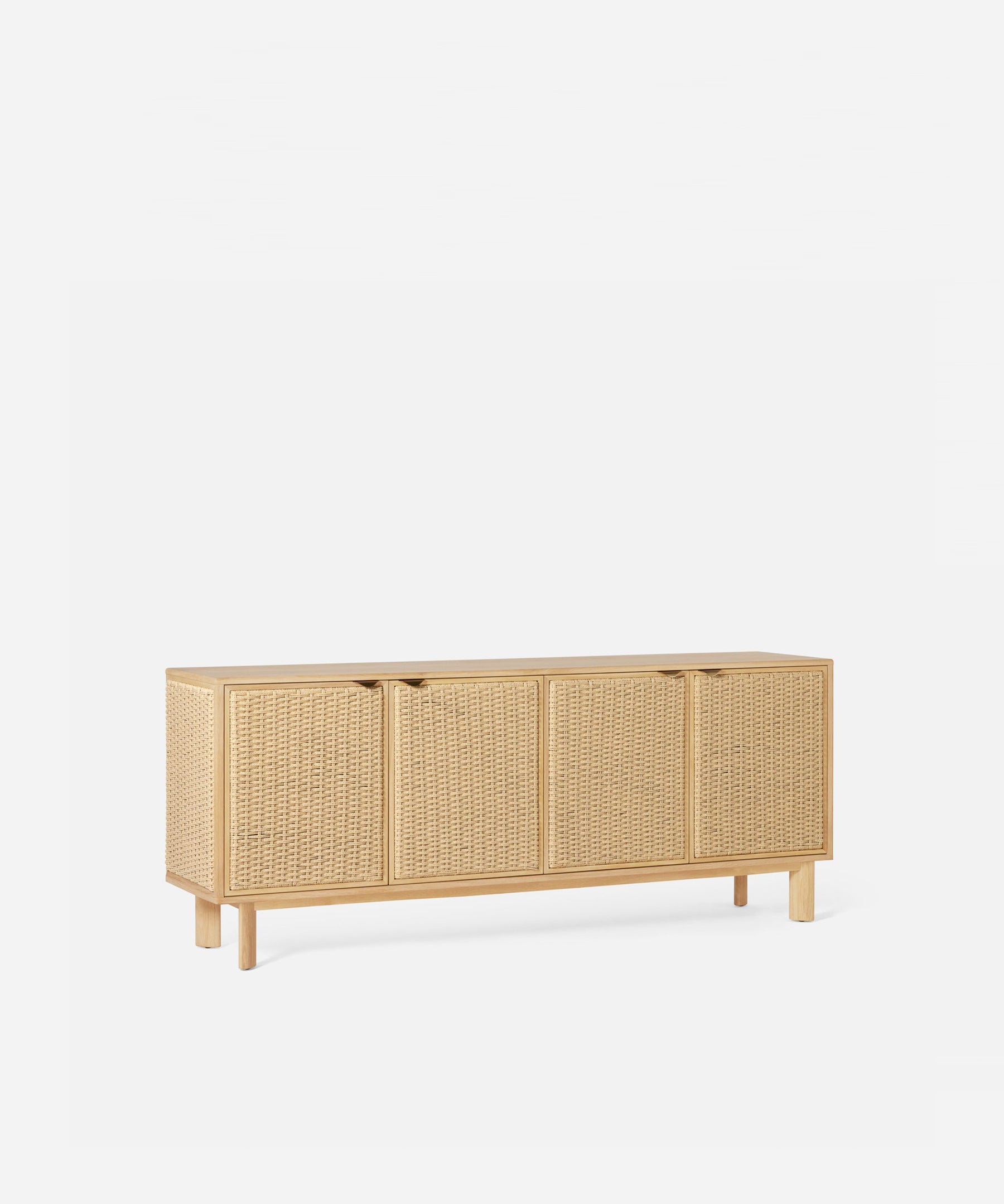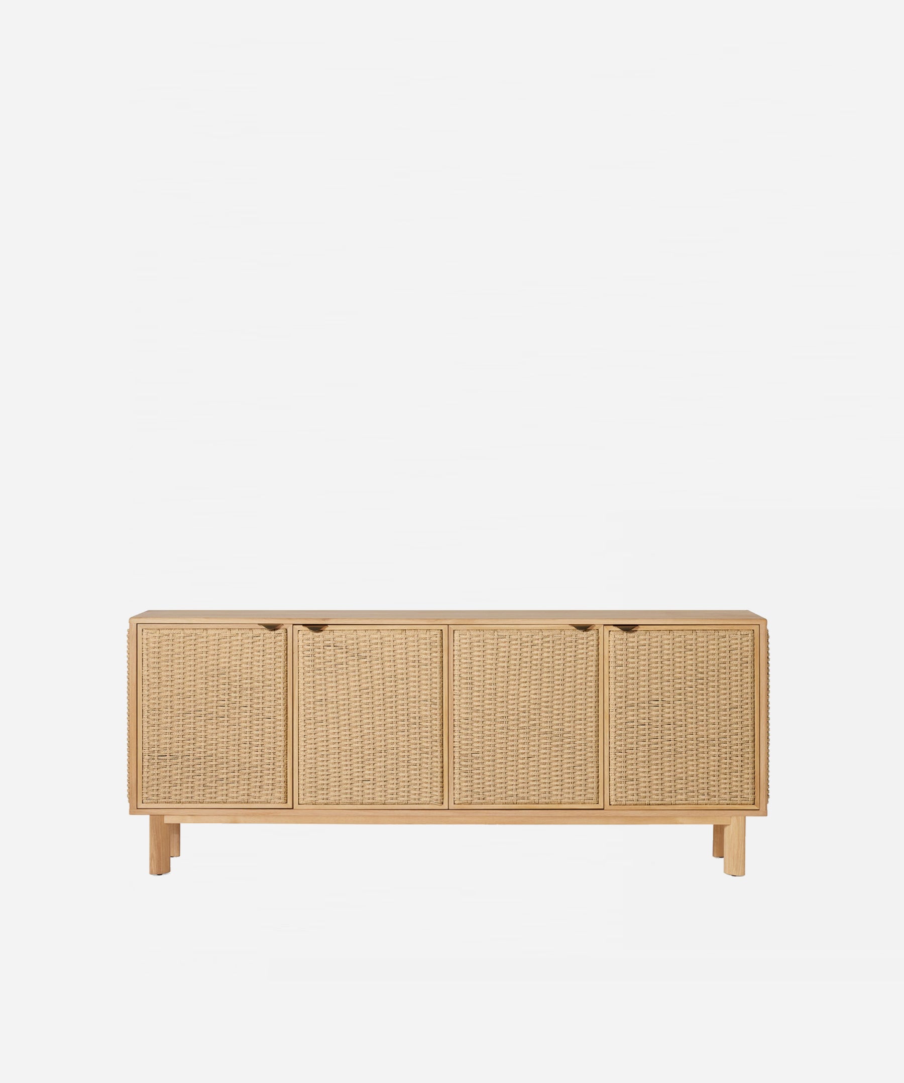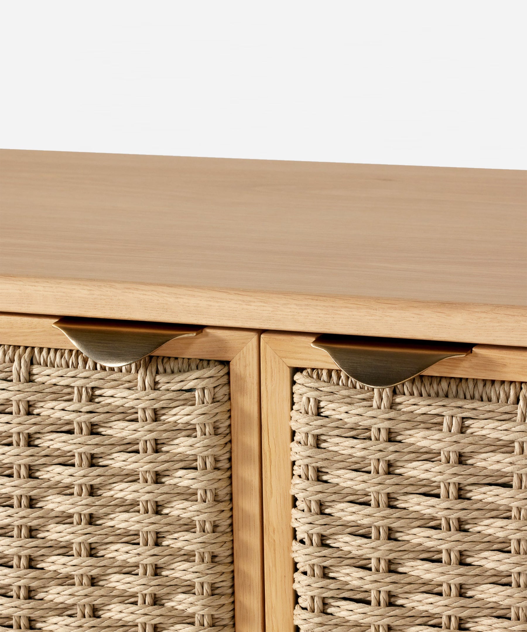 The Inigo Sideboard combines sleek modern design with natural elements, featuring an oak veneer frame and durable woven Danish cord panels. Its brass half-moon pulls add a refined touch, while two spacious interior shelves offer versatile storage. This piece effortlessly enhances any room with understated elegance.
