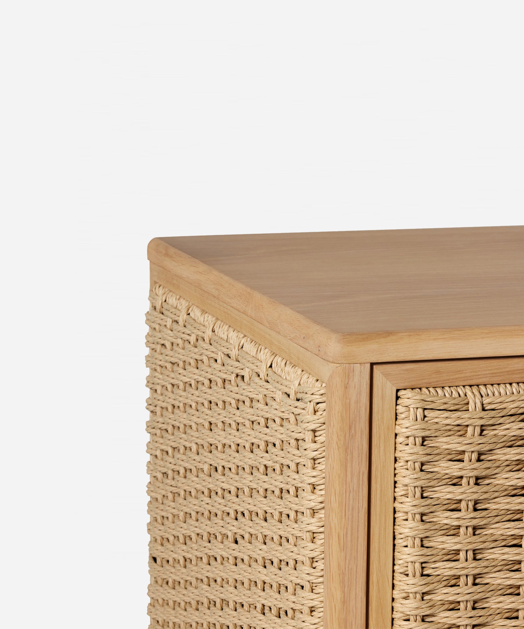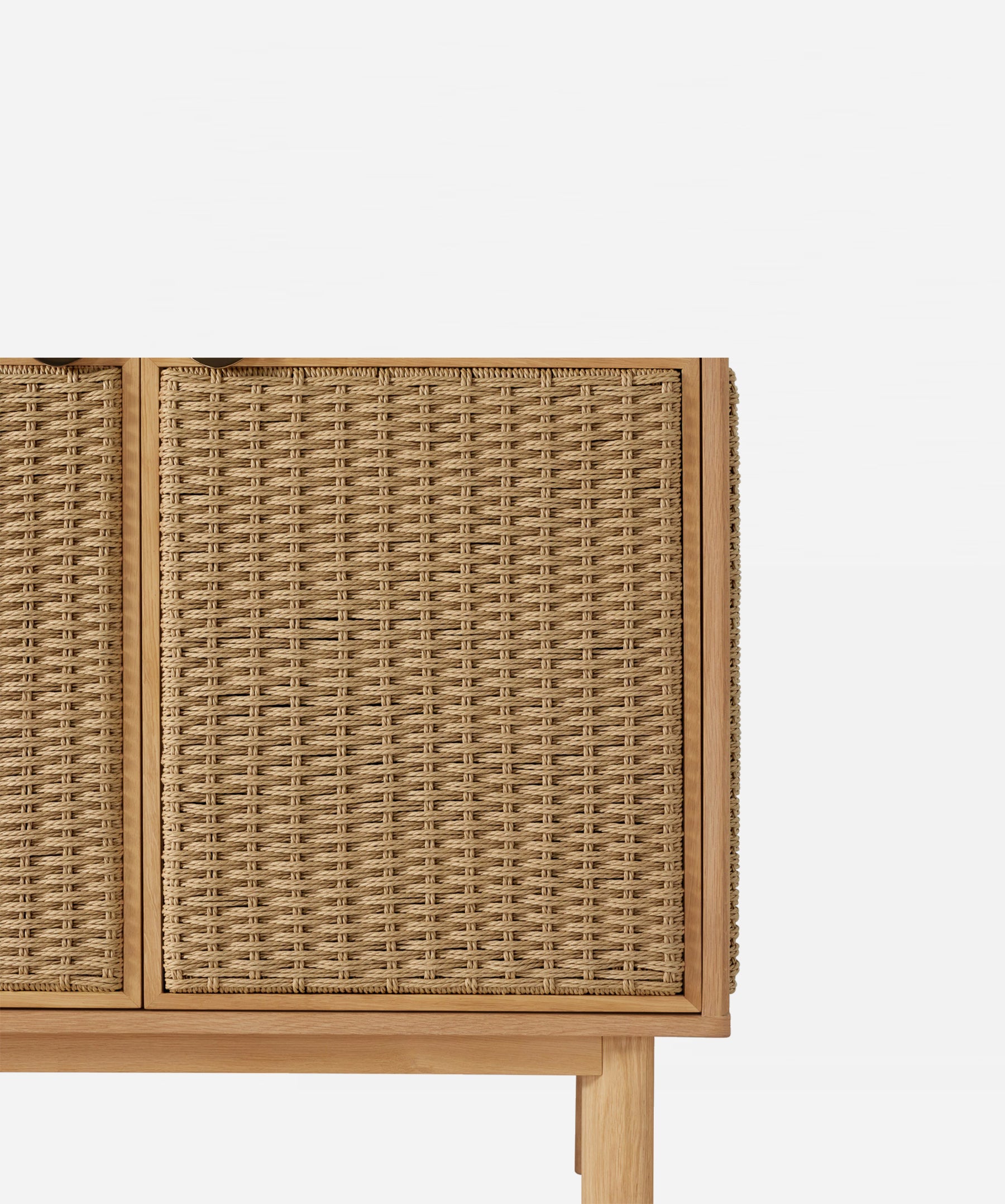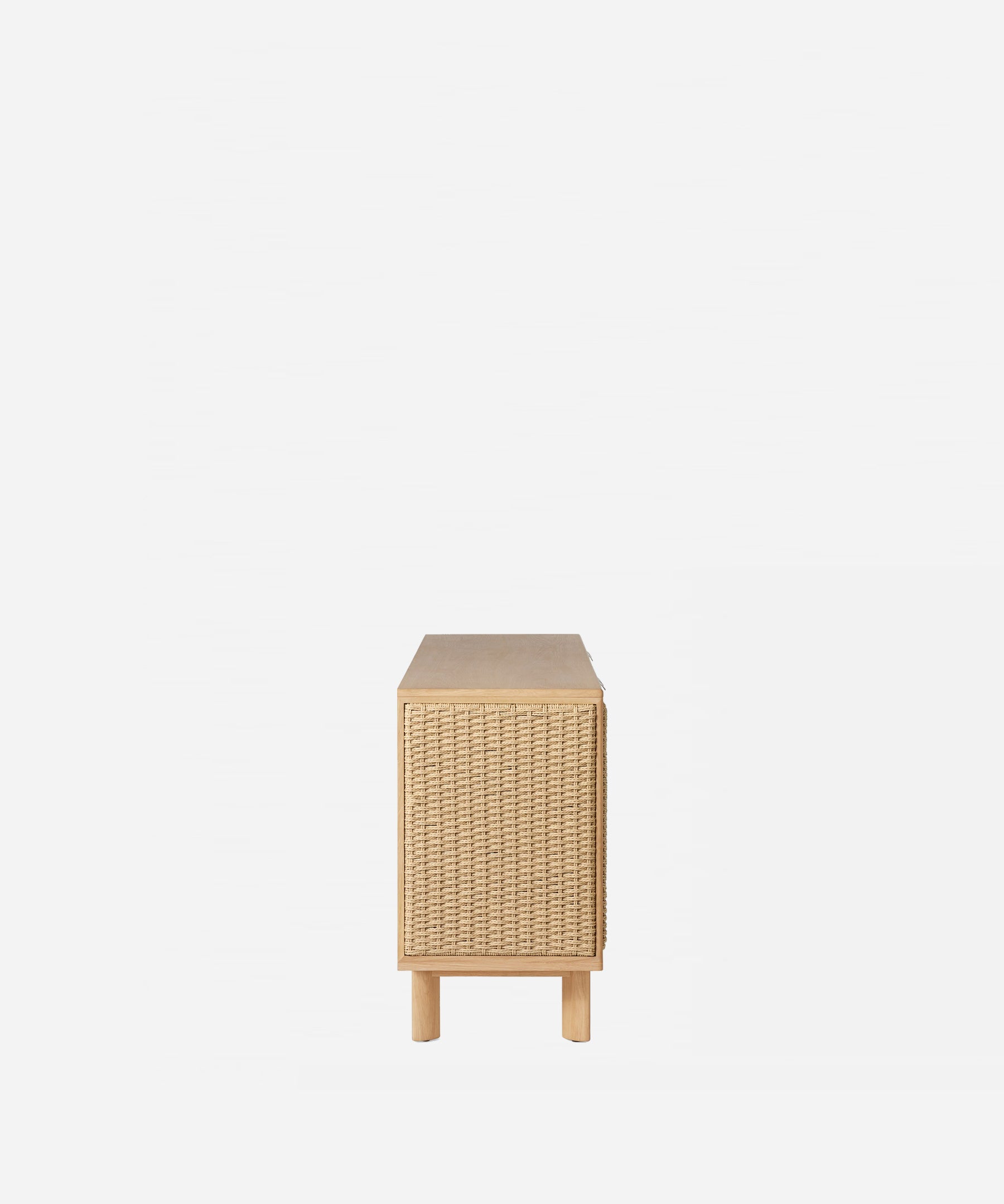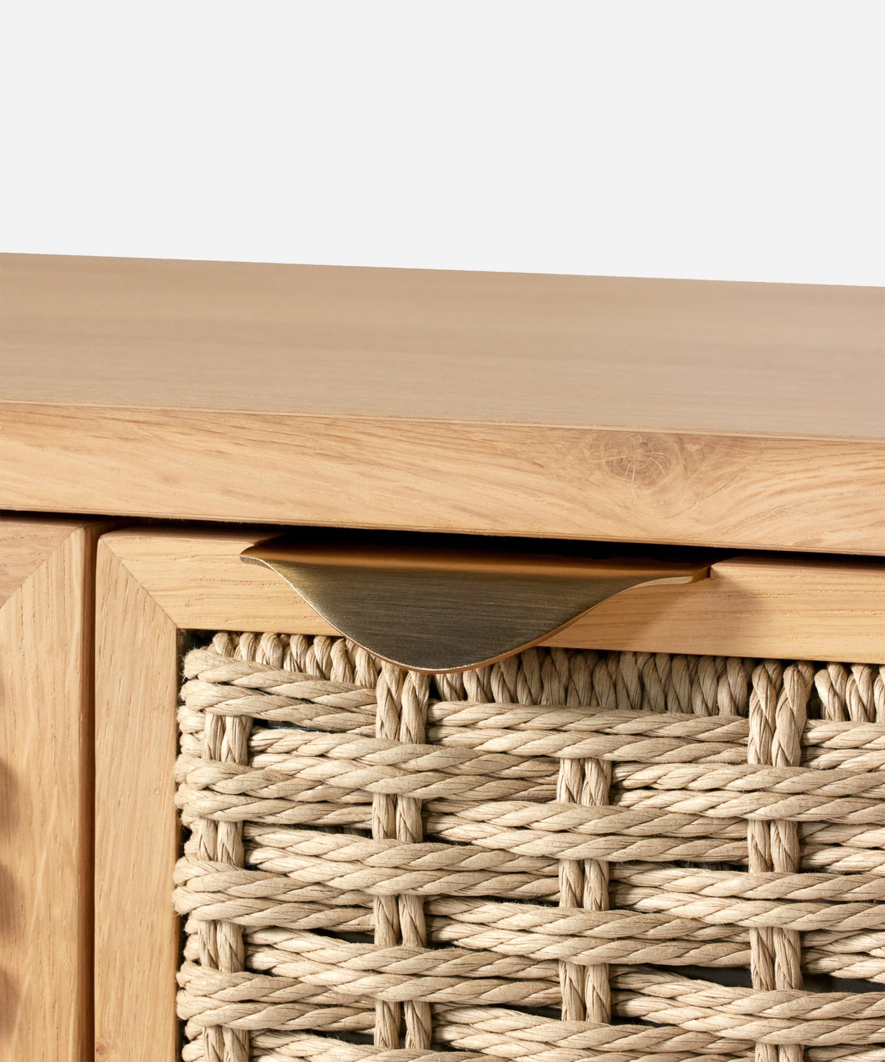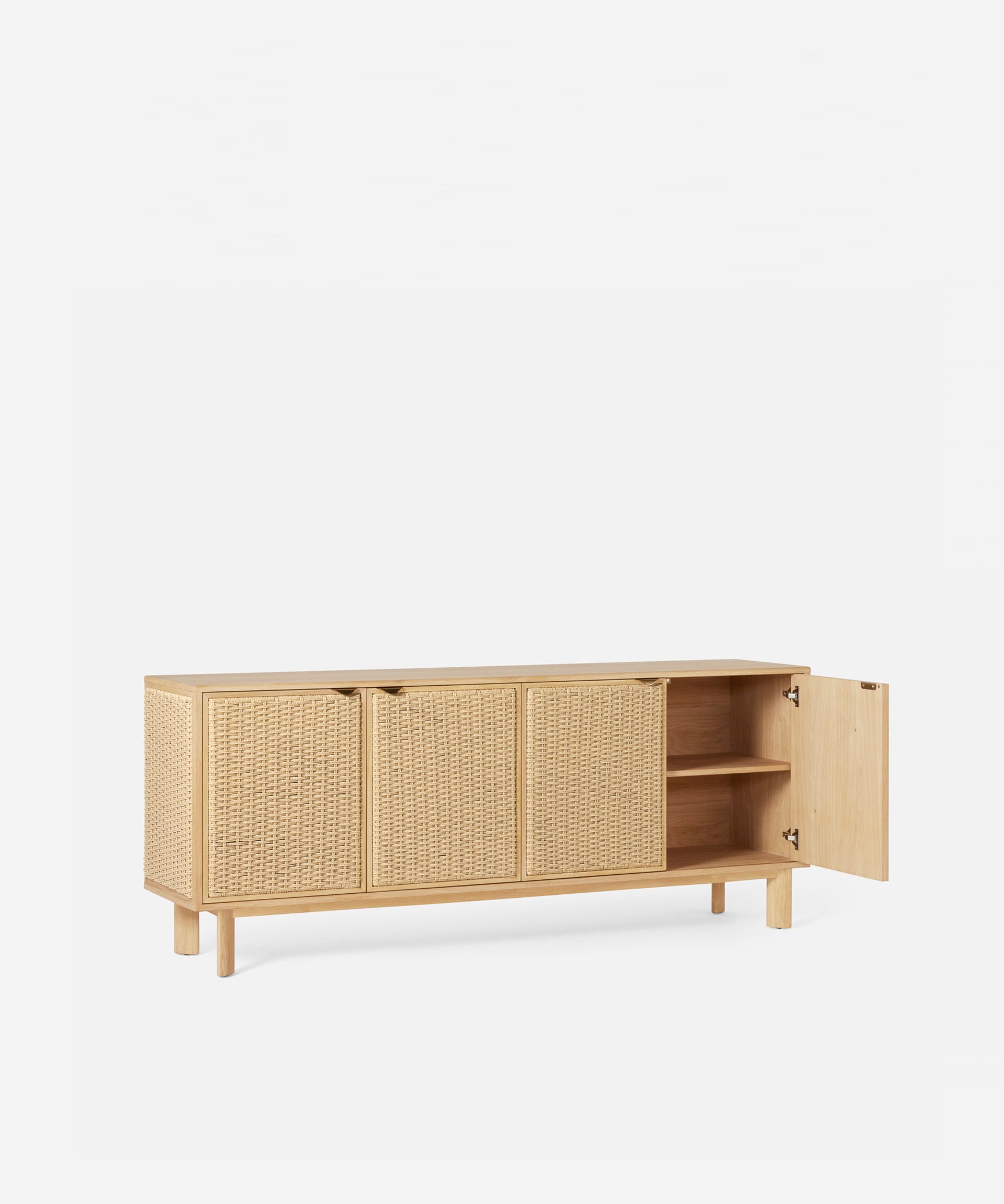 The Inigo Sideboard combines sleek modern design with natural elements, featuring an oak veneer frame and durable woven Danish cord panels. Its brass half-moon pulls add a refined touch, while two spacious interior shelves offer versatile storage. This piece effortlessly enhances any room with understated elegance.
