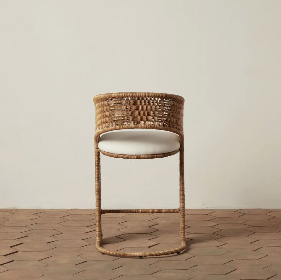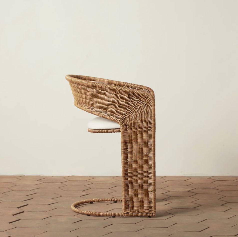 Inspired by a treasured vintage find, this curved-back counter stool blends sculptural lines with natural texture. Expertly handwoven wicker adds an organic touch, while the upholstered linen cushion provides comfort and ease. The result is a versatile piece that brings relaxed refinement to any space.