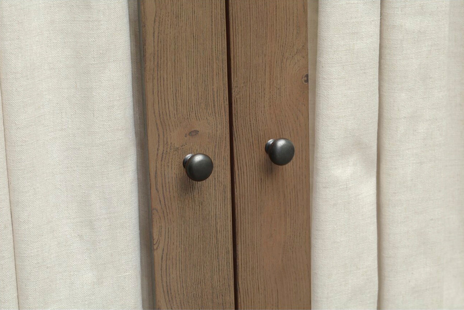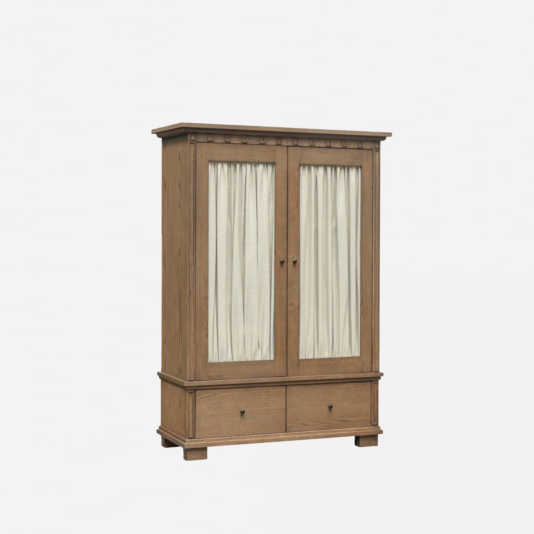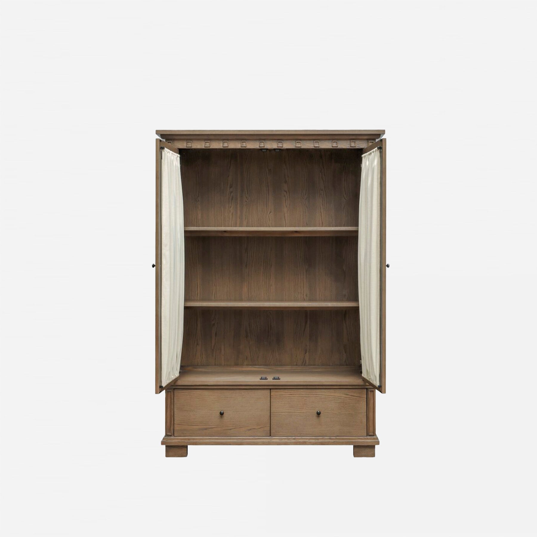 The Jules Cabinet elevates storage with timeless design. Crafted from solid ash and framed with glass doors, the tall silhouette blends traditional molding with a rich warm-brown finish. Inside, removable linen-textured panels soften the display or can be removed for a more streamlined look. Blackened bronze handles open to three shelves above and two deep drawers below, offering space to showcase what you love and tuck away what you don’t. A classic piece that balances beauty and function with ease.