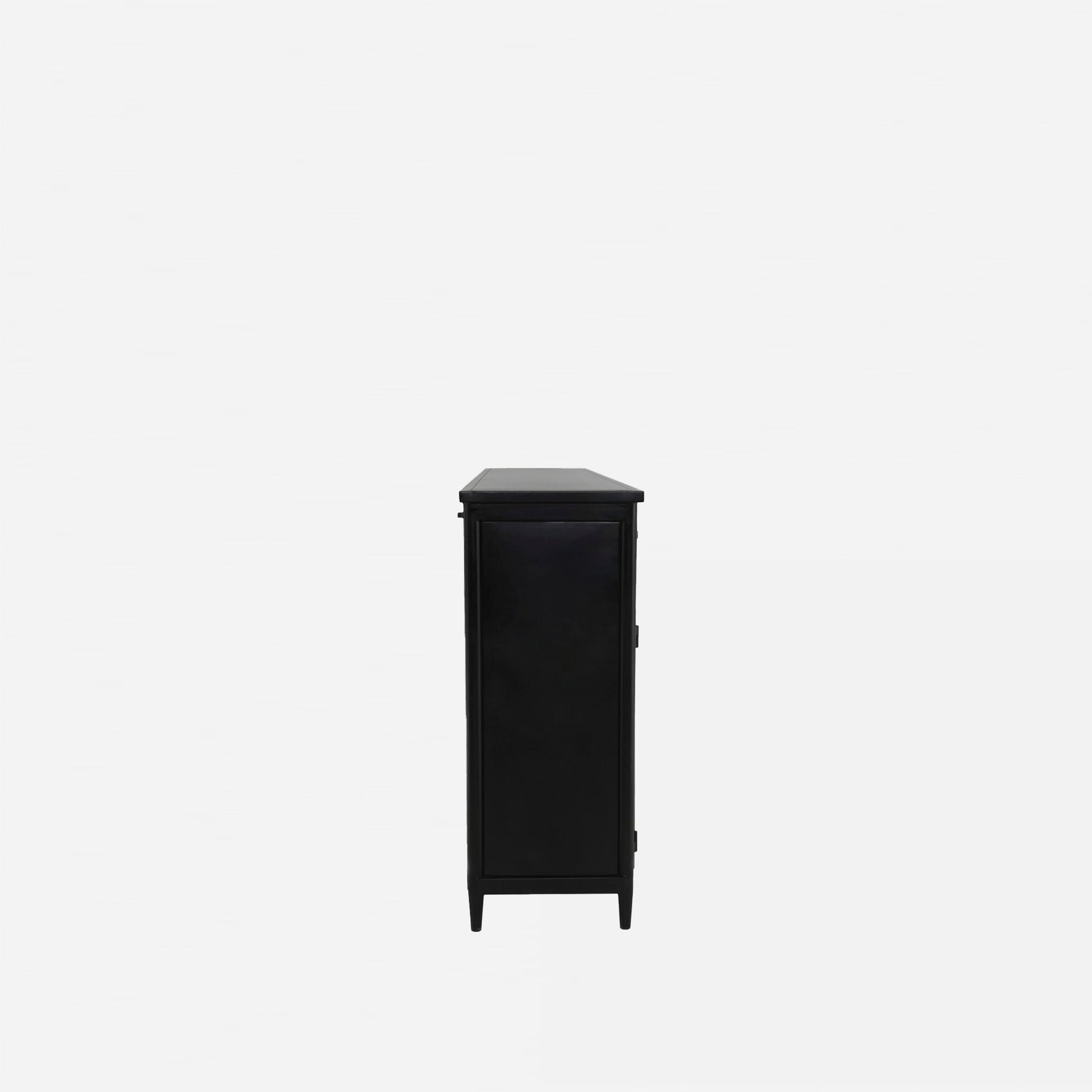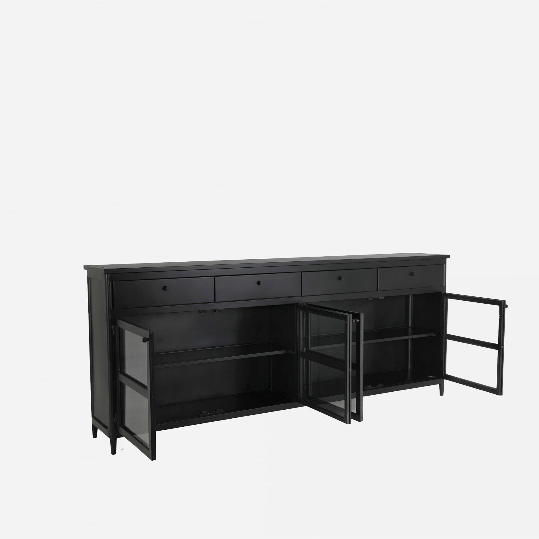 Built to stand apart. The Lark Sideboard makes its case in full metal, pairing clean transitional lines with a bold matte black powder-coated finish. Its mixed-material doors, half glass, half solid, strike a balance between display and concealment, while four drawers and four shelves keep everything in order. Textured, polished, and undeniably sleek, it’s storage that looks as good behind the scenes as it does on show.