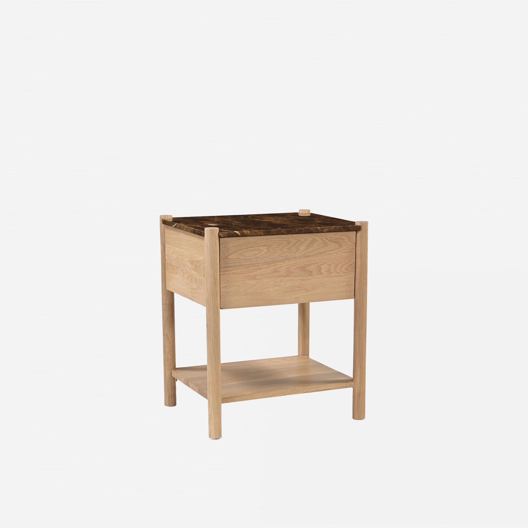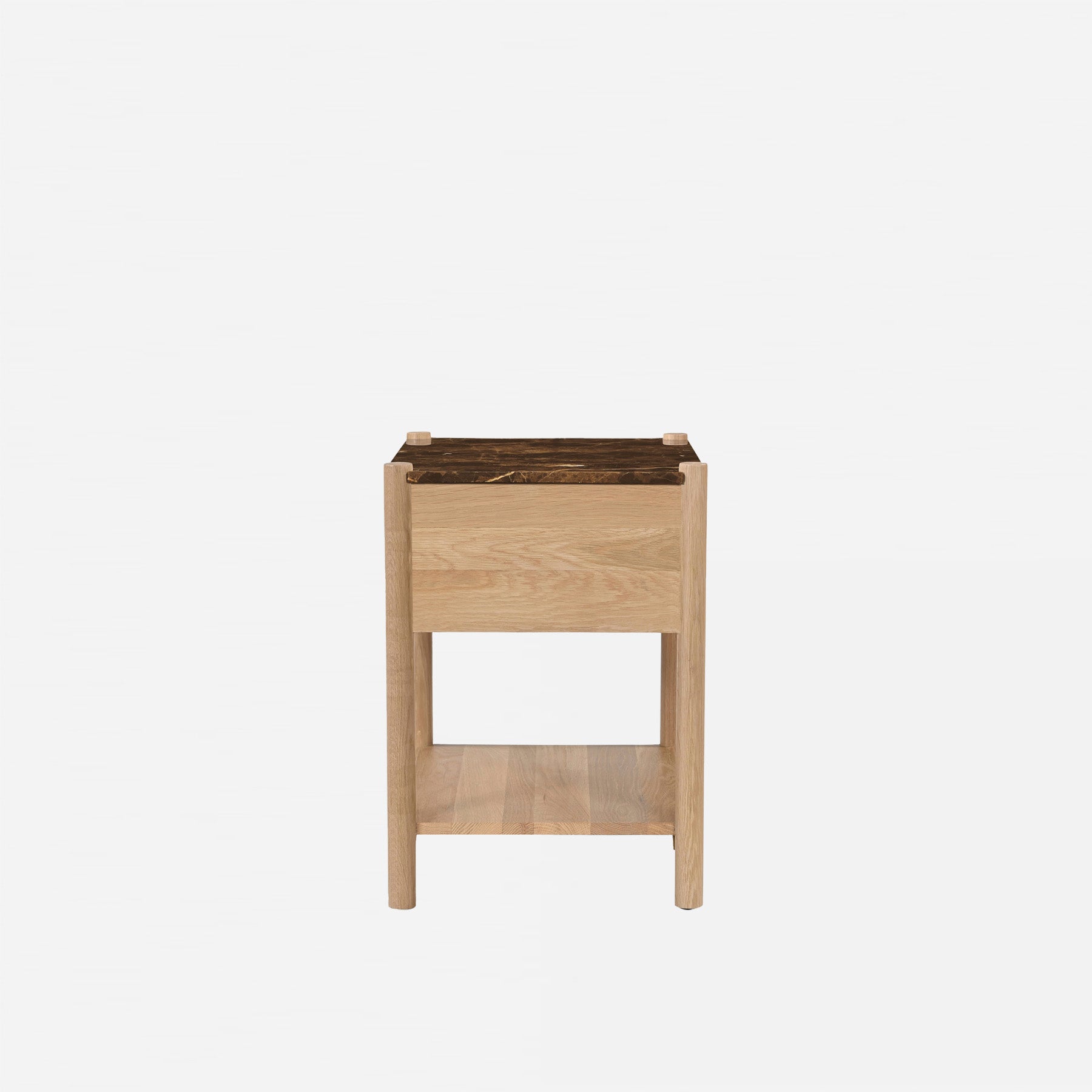 Indulge in the understated luxury of the Leonora Nightstand. Its transitional design melds rich dark Emperador marble with warm oak, creating a piece that exudes sophistication. The marble top, oak shelf, and soft-close drawer provide both style and functionality, while unique marble veining ensures each nightstand is one-of-a-kind.