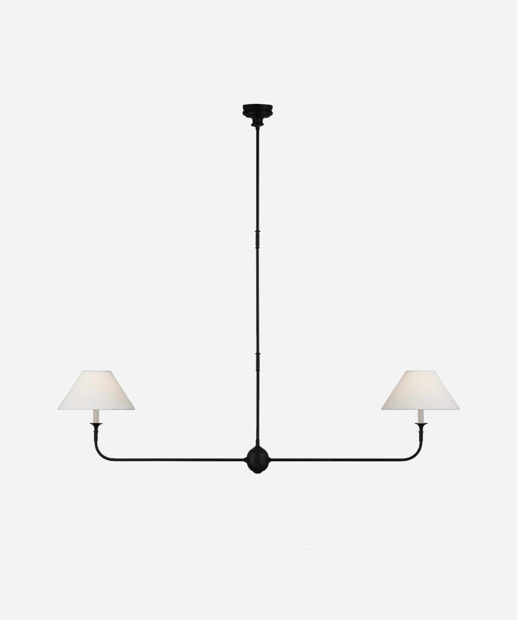 Defined by pronounced lines, the Leora Chandelier uses a straightforward suspension and elongated horizontal stem to create distance and cohesion. Balanced by a round weight in the center of the pendant and nuanced by subtle details, the Leora Chandelier elevates minimal design with a touch of classicism.