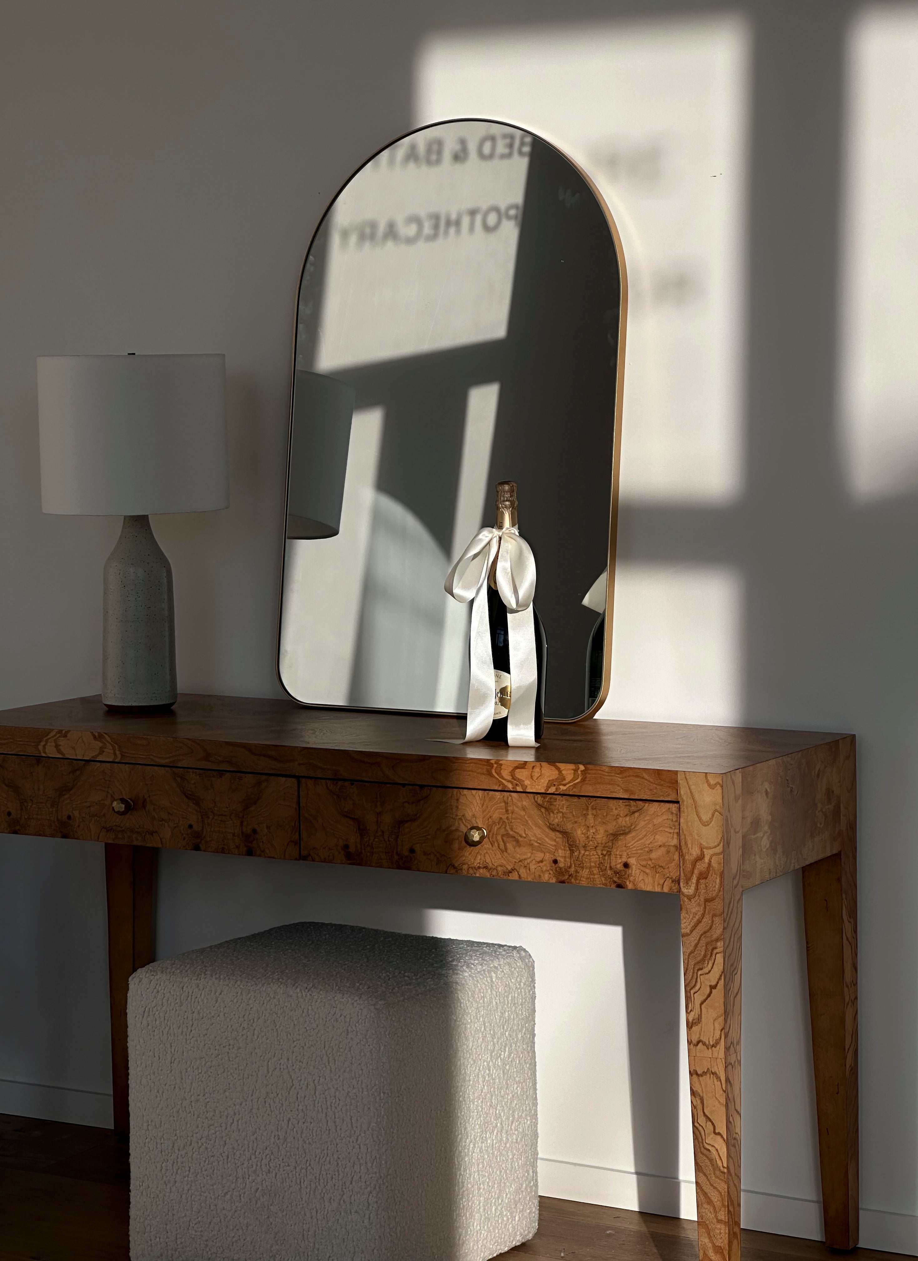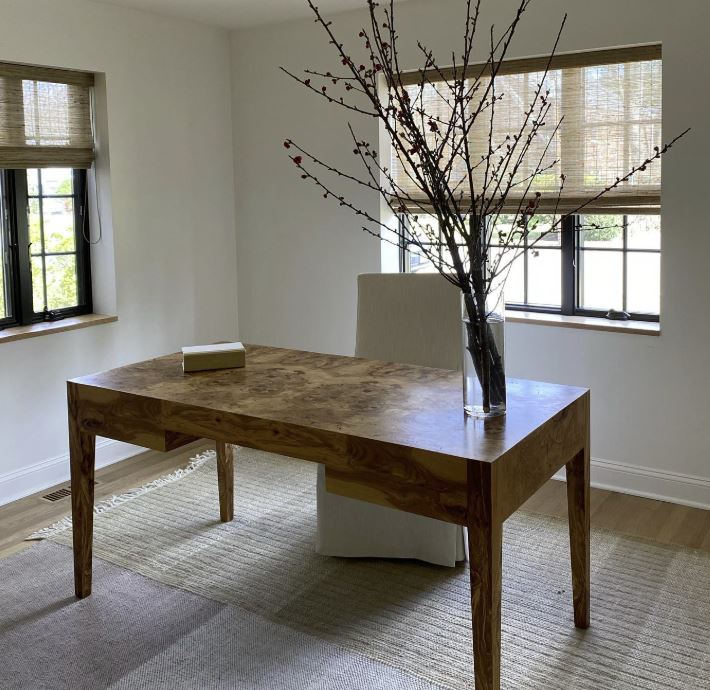 A simple silhouette lets the vibrant pattern of the Laurent veneer finish become the focus of this dynamic desk, also available with a broader surface for more space to work in comfort. Detailed variation highlights the piece's burled wood, and faceted brass hardware adds a polished finish.