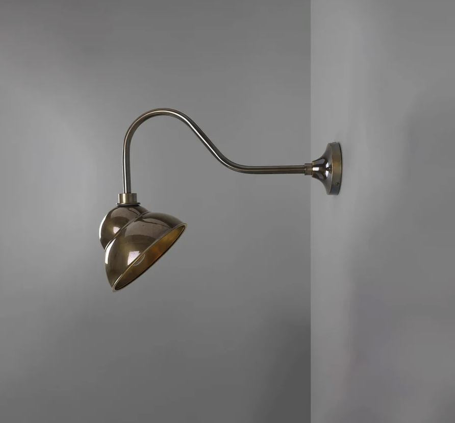 Highlighted by a curved metal post that positions the retro cap style lamp base to illuminate siding, walkways, porches, patios or entrances, our Lynn Wall Light is a sophisticated selection for Indoor/outdoor lighting. Crafted from a combination of brass and steel, this light is the durable choice preferred by exterior decorators and designers. With an industrial edge, the Lynn Wall Light is great for illuminating signs, banners and awnings as well as your outdoor dining or lounge space. Designed to be mounted above or to the side of the object to be illuminated, the Lynn's swan neck arm is configured to hold fixtures at a desirable distance from lit areas.