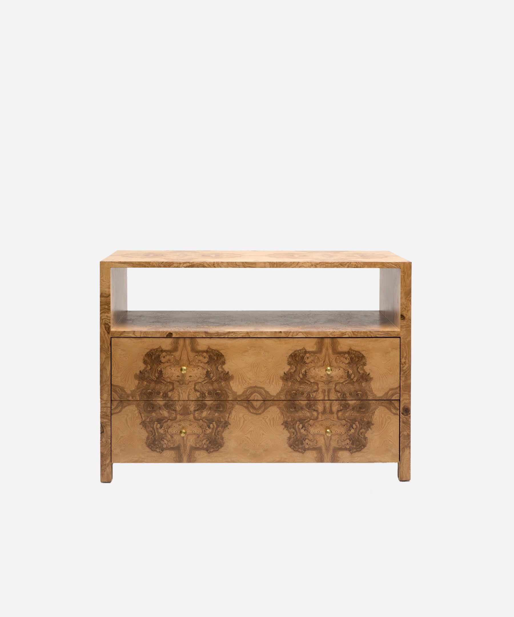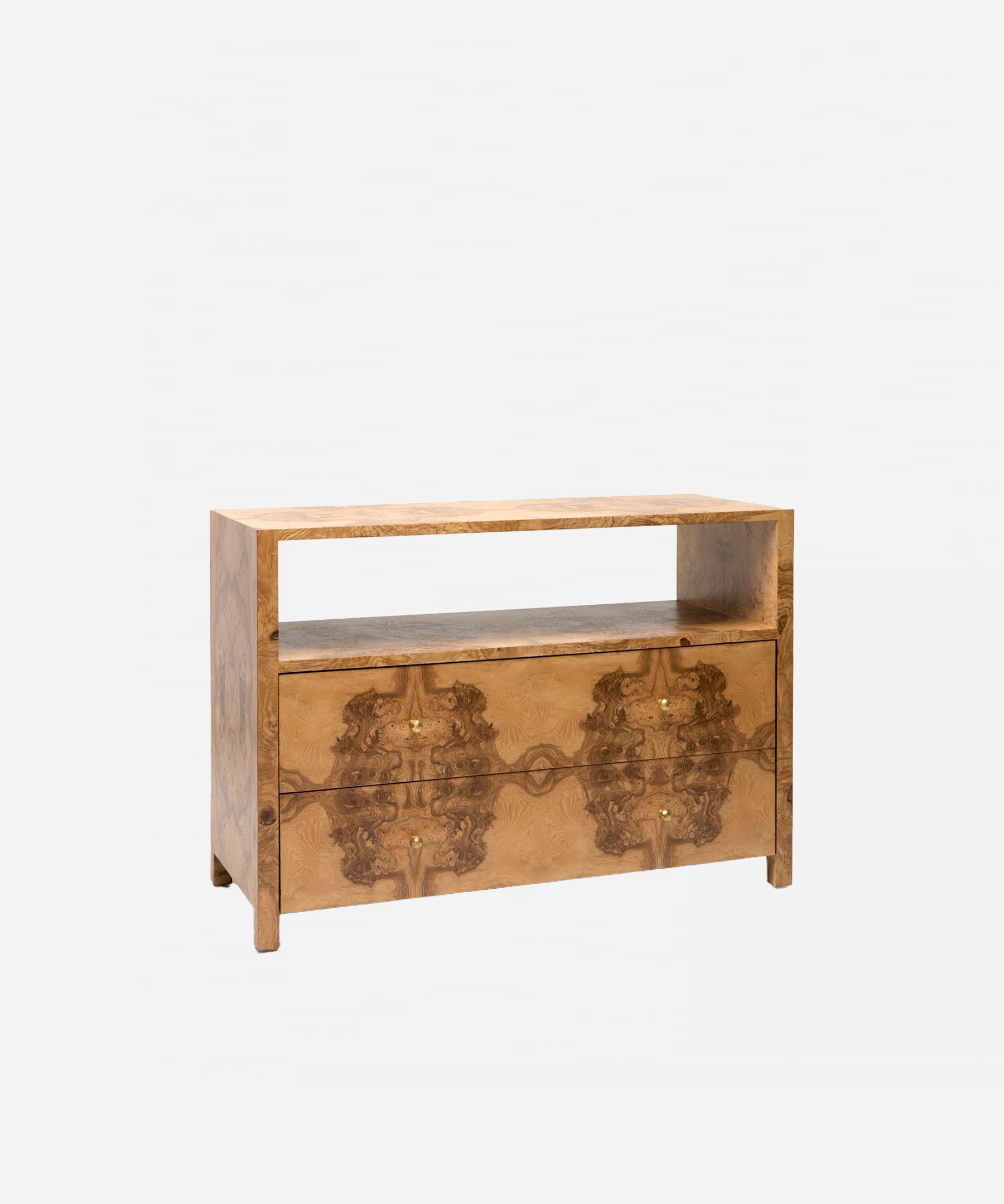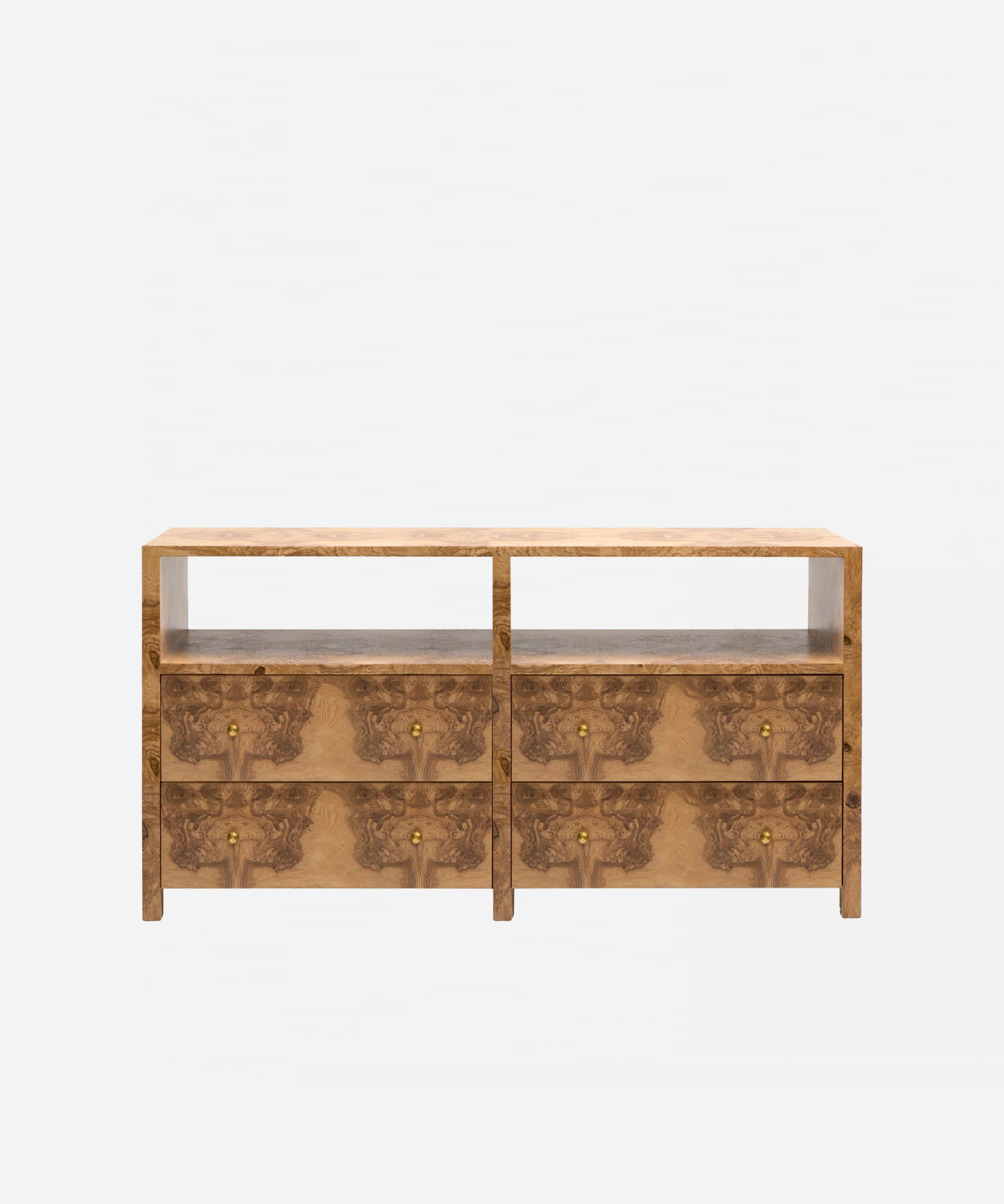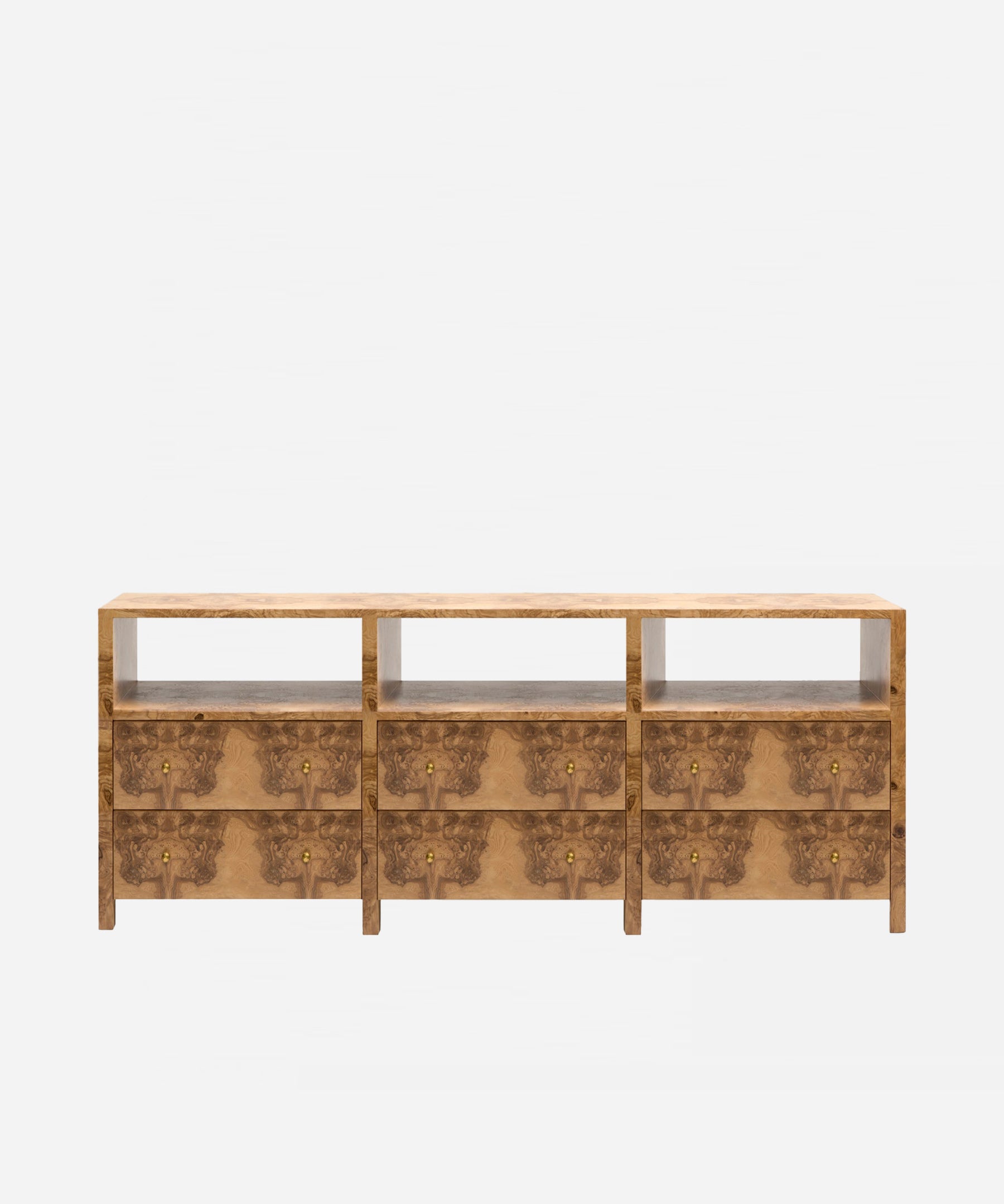The Marais Sideboard combines elegant olive ash veneer with functional design, featuring open shelves at the top for display or easy access, complemented by two rows of spacious drawers below. Accented with refined brass knobs, this piece offers both style and ample storage, making it a sophisticated addition to any living space.