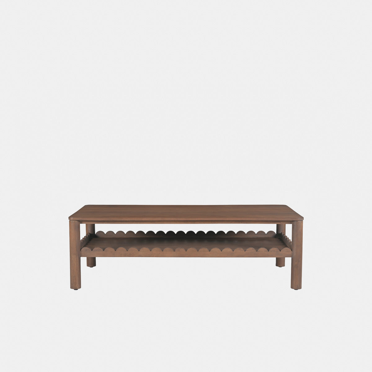 Introduce modern elegance into your home with the Margaux coffee table. Meticulously crafted with sleek, geometric curves and strong legs, this piece effortlessly blends traditional design with contemporary aesthetics. The intricate scalloped edge details and exposed lower shelf showcase timeless charm and classical influences.