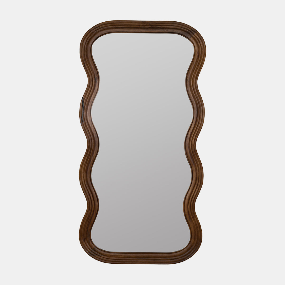 The Mirabelle Floor Mirror is a stylish addition to any room. Its curved shape and walnut wood frame add a touch of elegance, while providing a functional full-length reflection. Crafted with quality materials, this mirror is both durable and attractive. Enhance your space with this sleek and timeless piece.