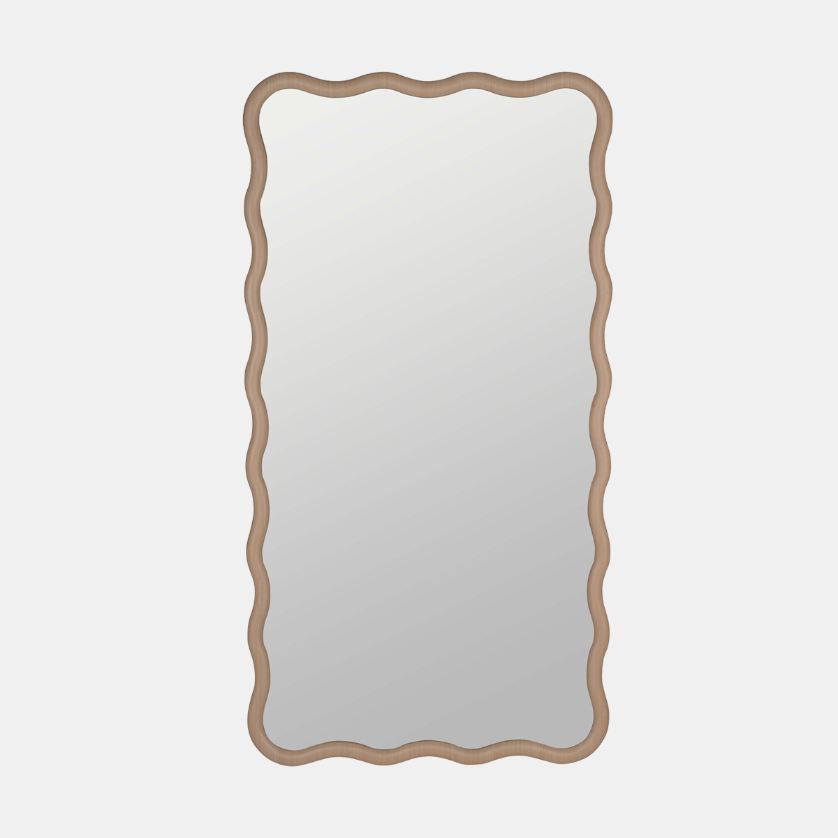 The Isadora Floor Mirror features a stunning Natural Oak Wood frame with a unique wave shape. Its design allows for a full-length reflection and adds a touch of elegance to any room.