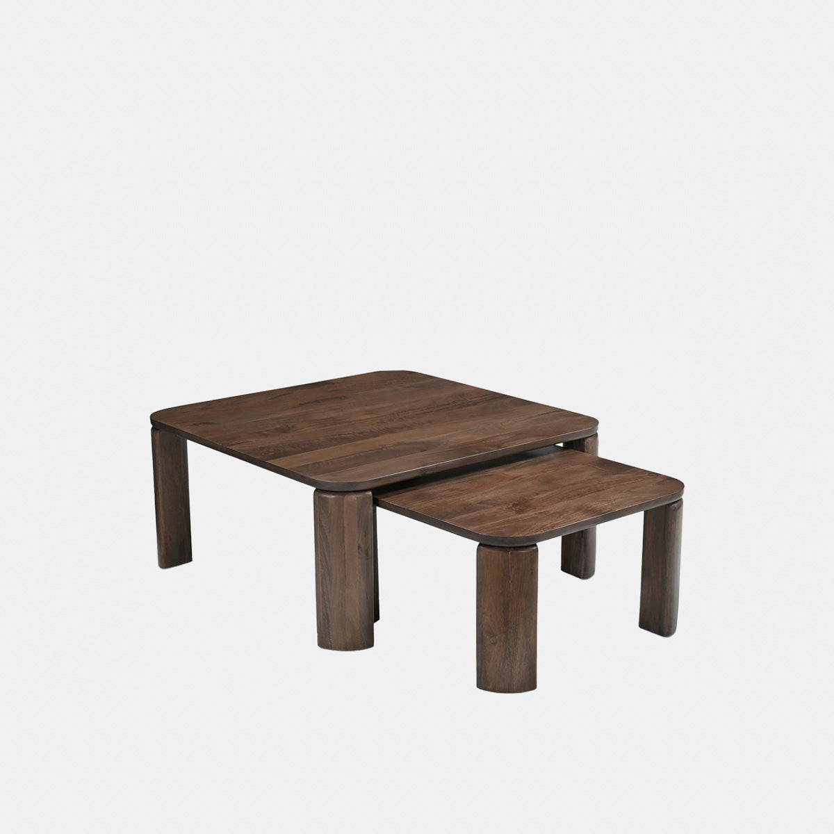 Elevate your living space with the Nest Coffee Table set. Its unique rounded square design and four 1/4 cylindrical legs offer a sophisticated touch while providing practical use. Crafted with rich dark brown mango wood and softened edges, this set exudes elegance and functionality.