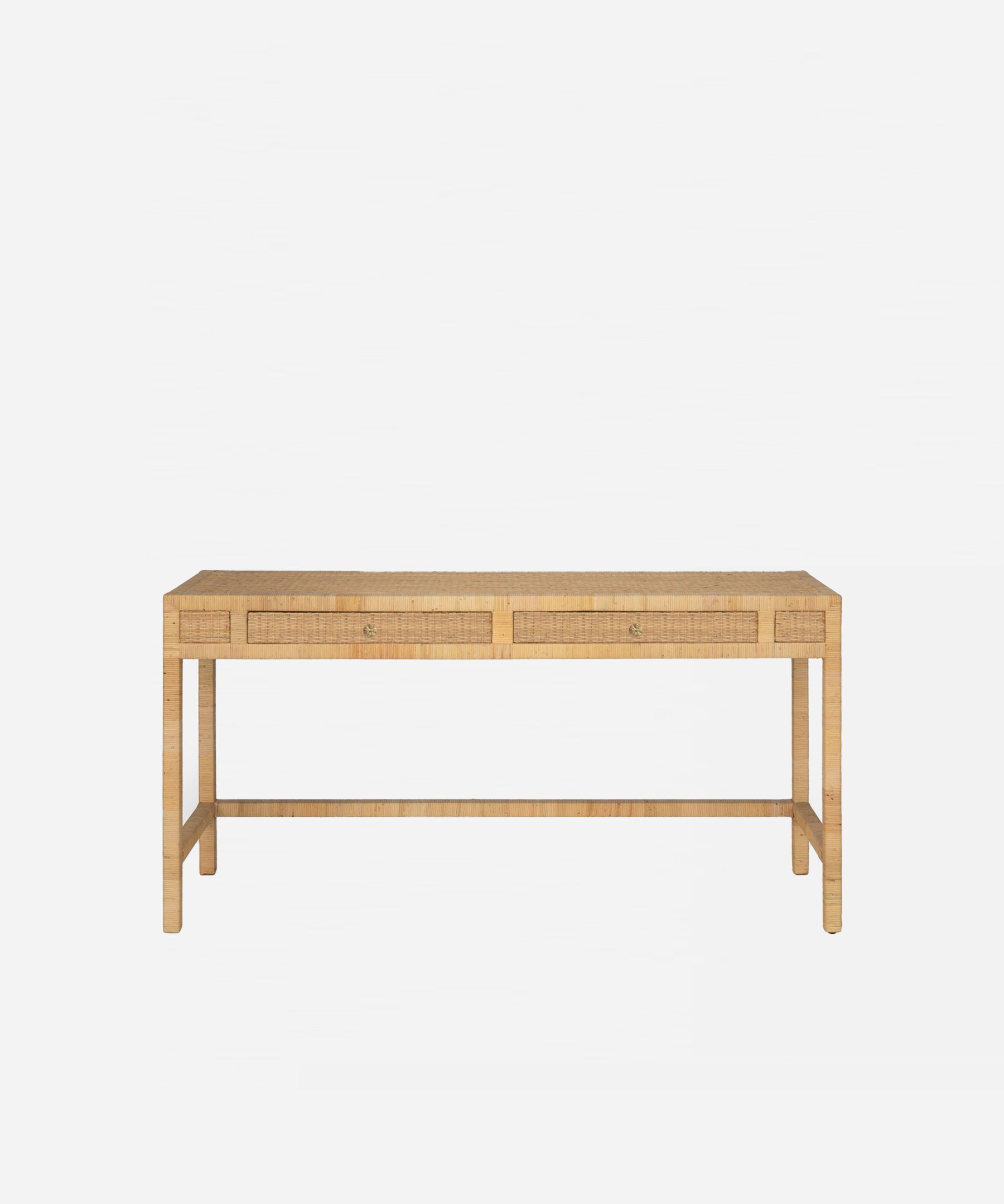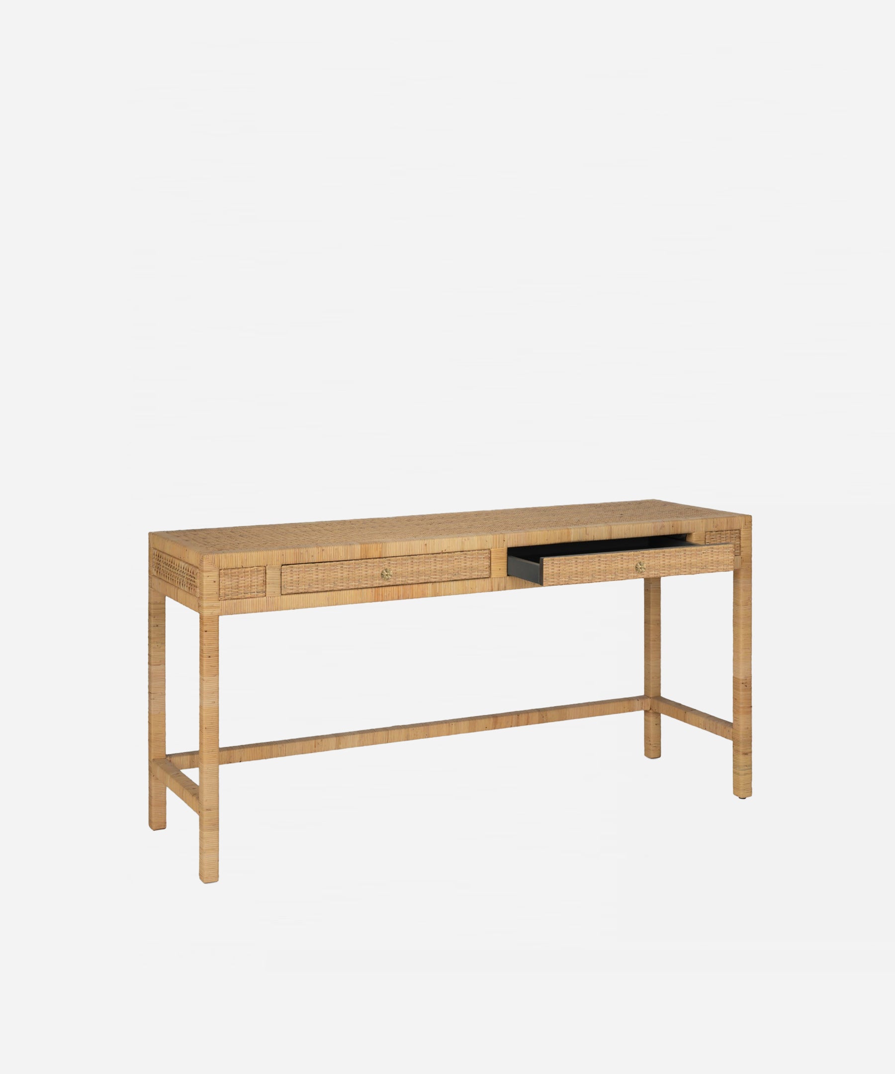 The Ottilie Console Table blends natural peeled rattan with refined craftsmanship for a modern, sophisticated look. Its tightly wrapped frame and slender legs, reinforced by a box stretcher, offer sturdy elegance. The dense basket weave on the top and sides adds texture, while soft-close drawers with dark gray stained interiors and flower-patterned gold knobs bring subtle luxury and functionality to your space.