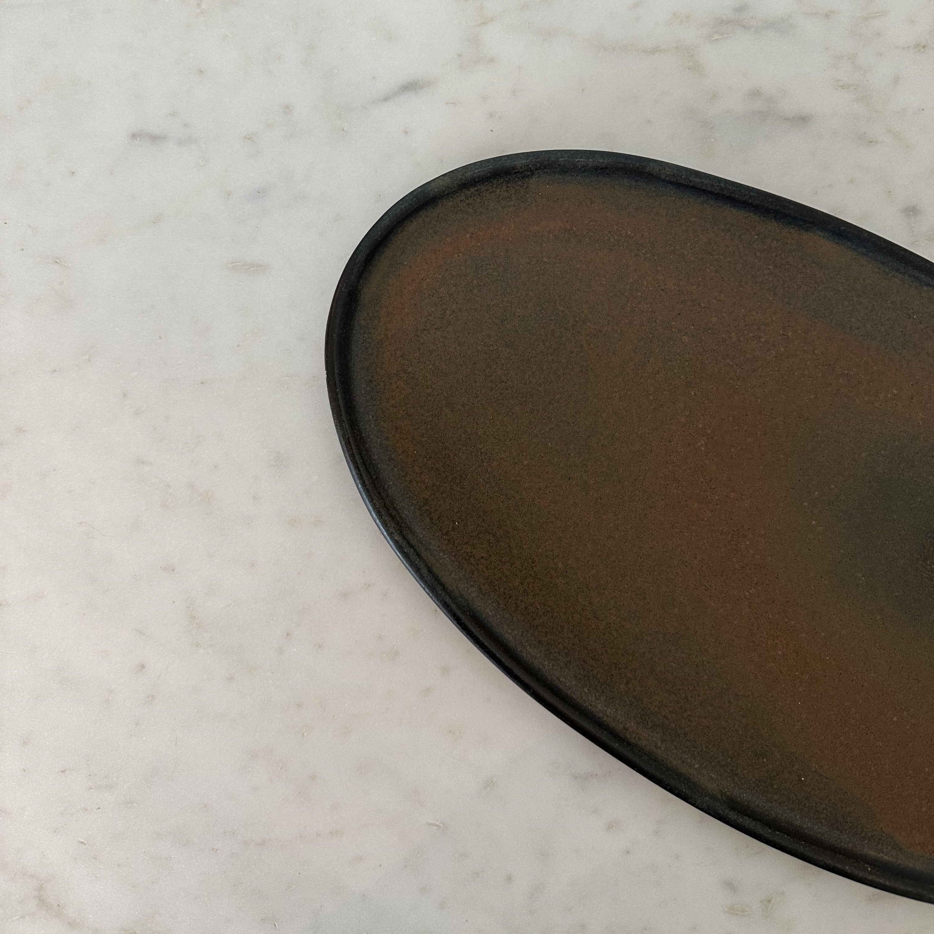 The Oval Stoneware Platter is skillfully crafted in Ukraine by talented young artists, using top-quality organic materials. It beautifully blends rustic charm with practicality, featuring a distinctive glossy surface created by hand-dipping in a textured reactive glaze. This versatile platter is perfect for displaying everything from tasty nibbles or bathroom accessories, to a curated selection of favorites, all while promoting sustainable and artisanal craftsmanship.