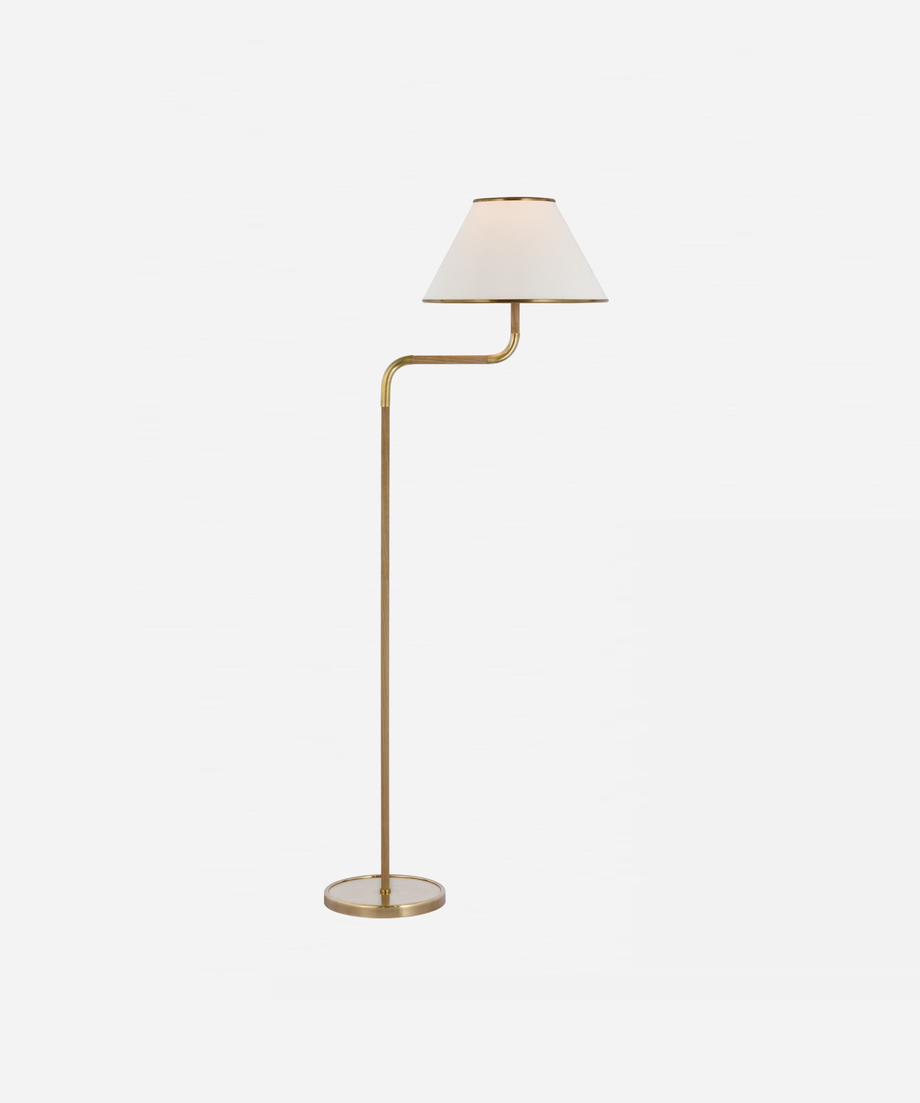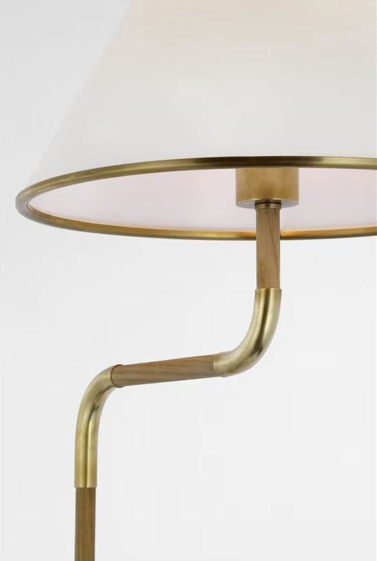 With a modern silhouette, the Rigby Floor Lamp brings simplicity to your decor with a unique mix of materials. The white linen fabric shade is accented by wood and brass structure with a bent arm.