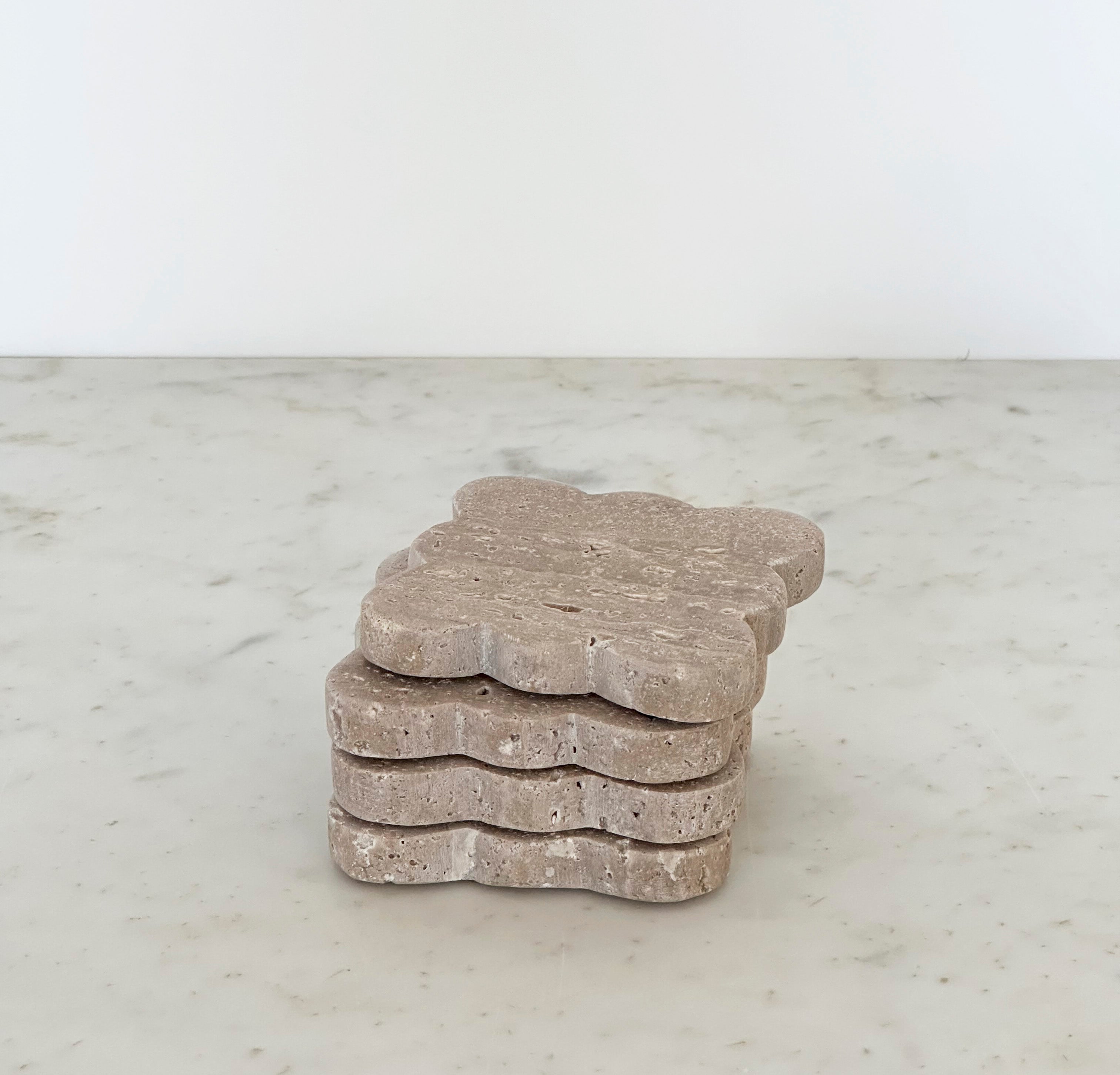 This set of four square travertine coasters features elegantly scalloped edges that enhance their natural stone texture and color variations, ensuring each piece is uniquely captivating. Measuring 4 inches square, they offer ample space to protect surfaces while complementing a range of interior styles. Combining practicality with refined artistry, these coasters elevate any gathering with subtle sophistication and lasting charm.