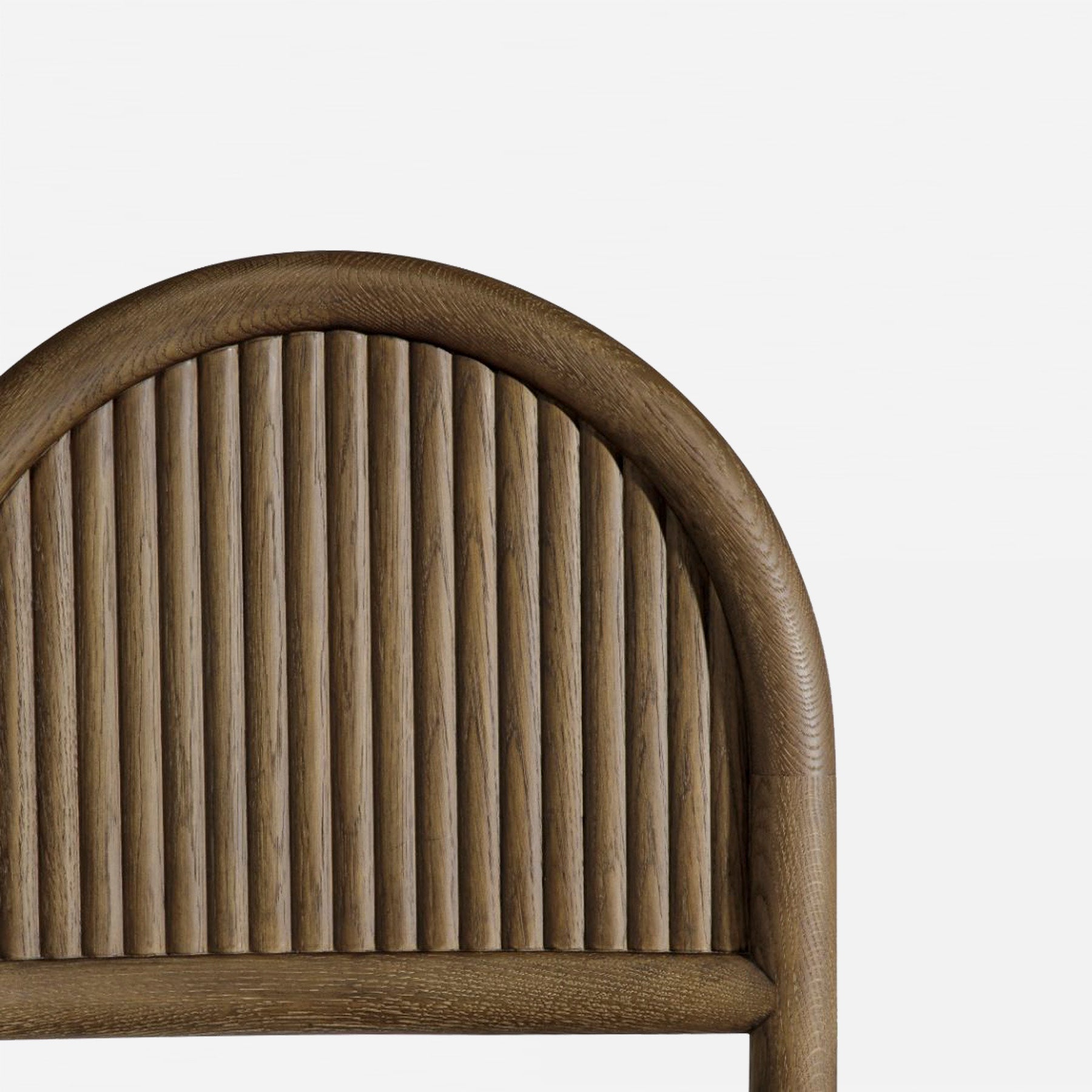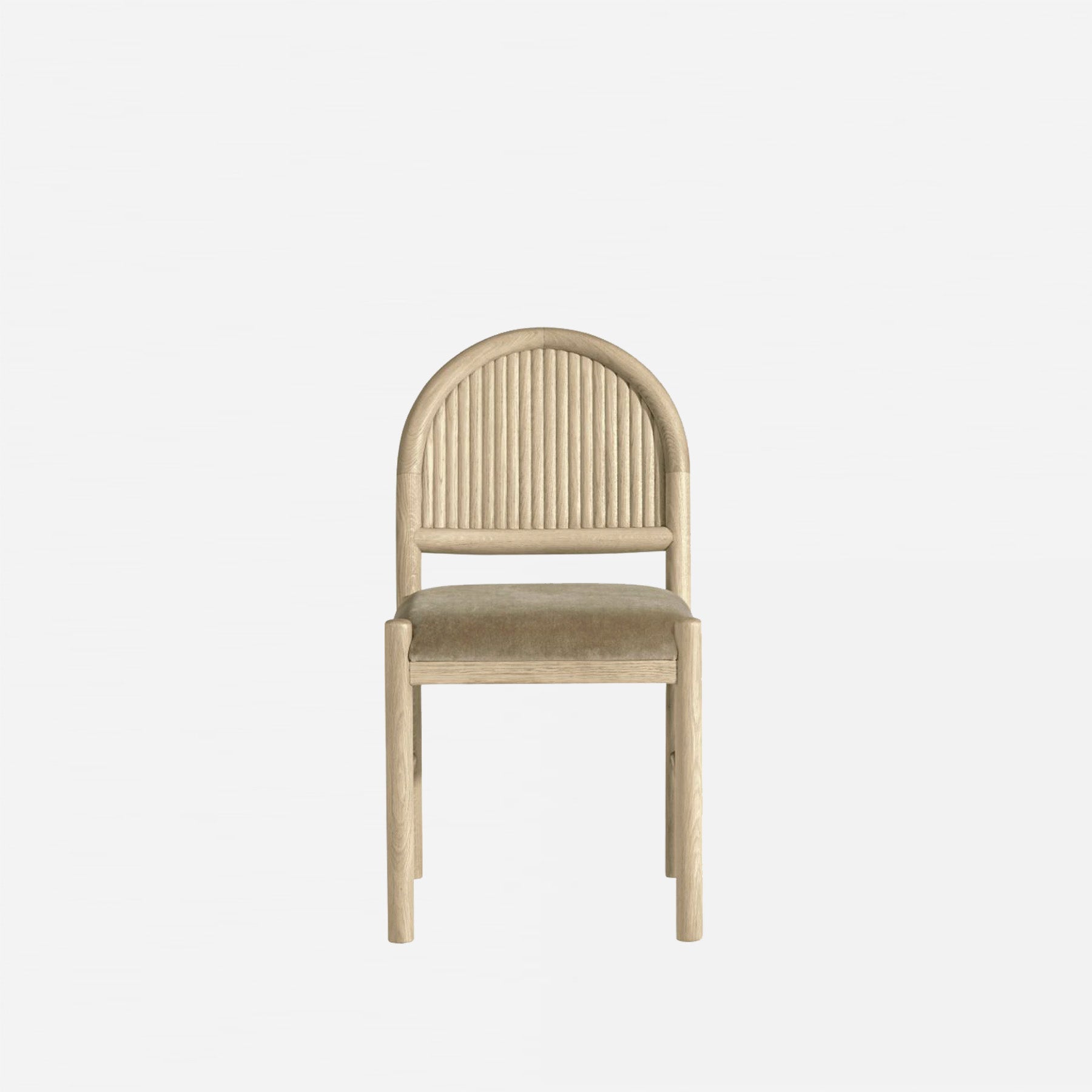 The Selene arched dining chair features a reeded back for elegant texture with a plush velvet seat for comfort and style.
