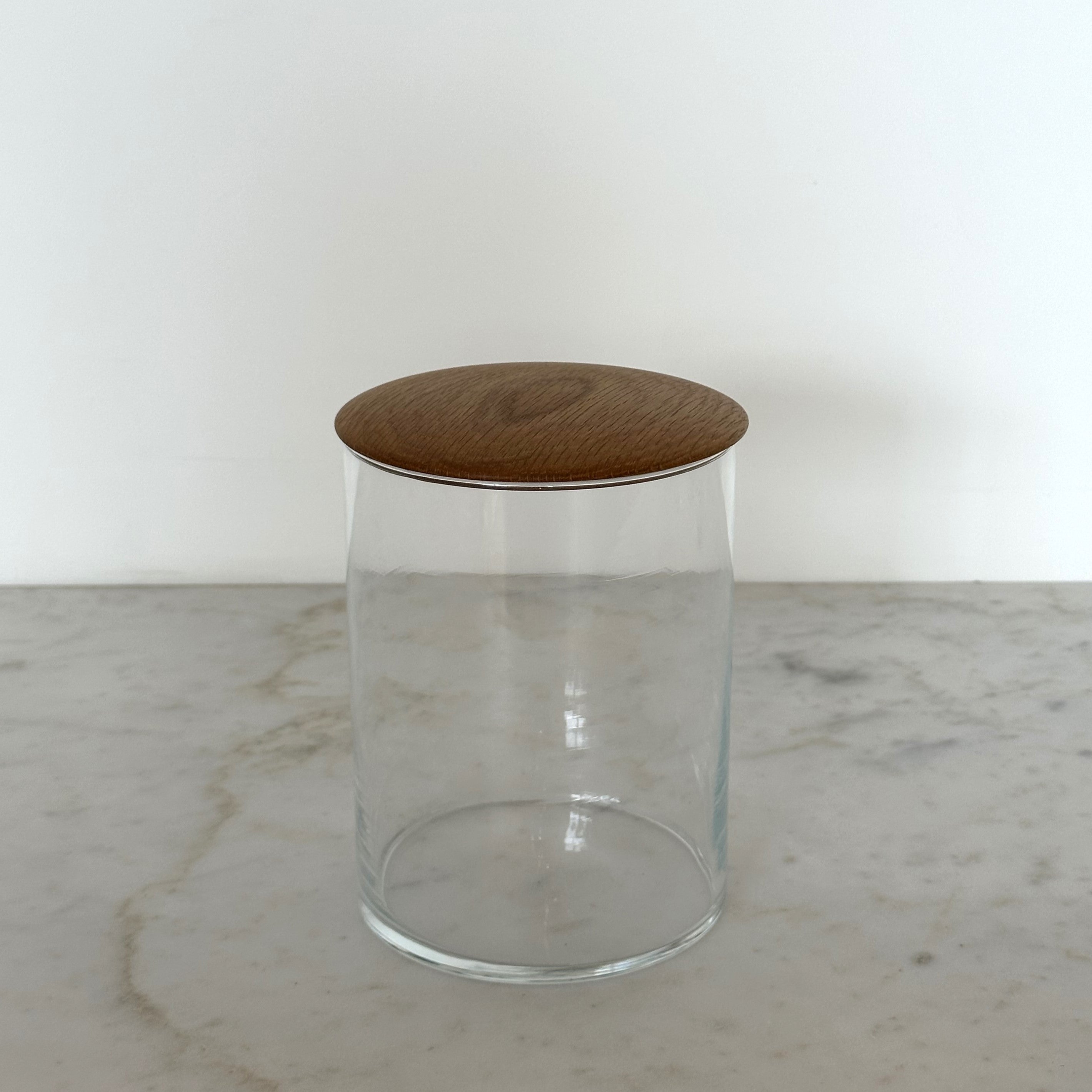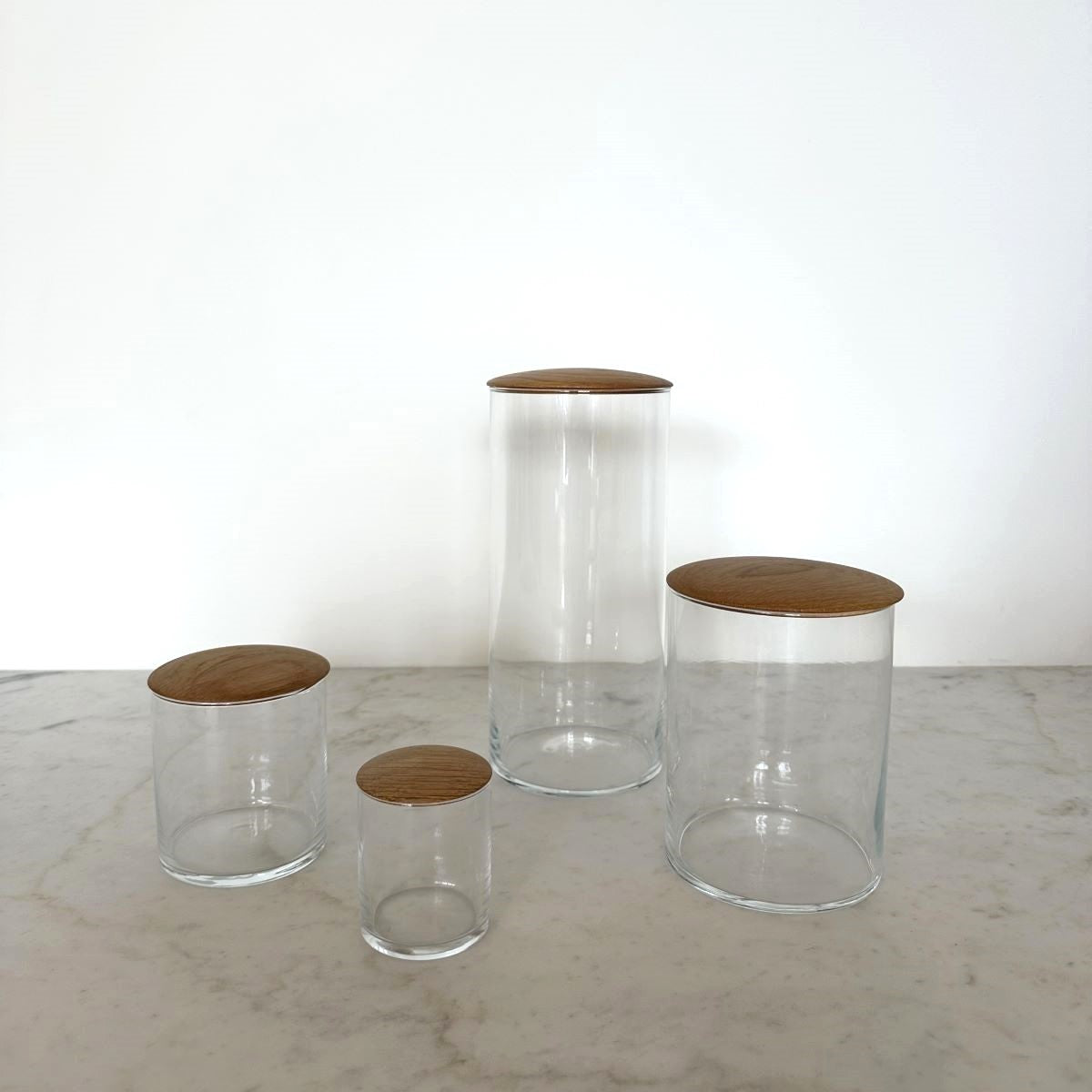 The Simple Storage Container combines sleek glass design with oil-rubbed, intricately crafted oak lids. Ideal for keeping bathroom essentials organized, these containers are equally practical as small collection storage or as decorative pieces. Arrange them together for a captivating touch to any shelf or countertop, enhancing the overall aesthetic.