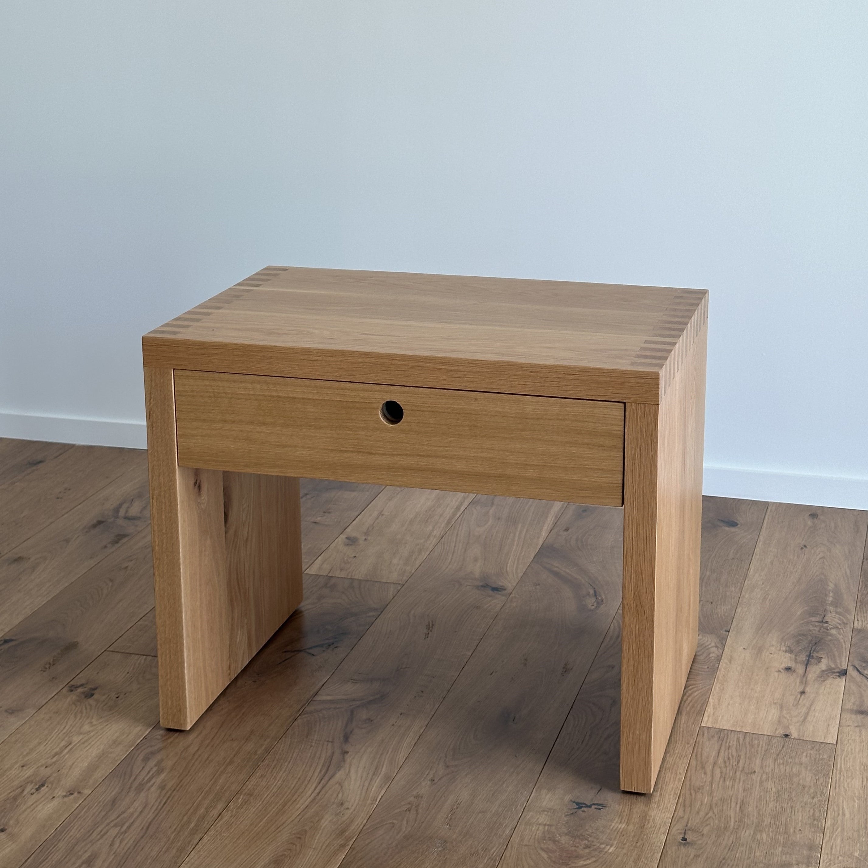 Featuring a sleek, modern design with clean lines and a natural oak finish, The Tranel Nightstand offers both aesthetic appeal and practical use. The minimal look and box joint detail make it a standout piece in any home.