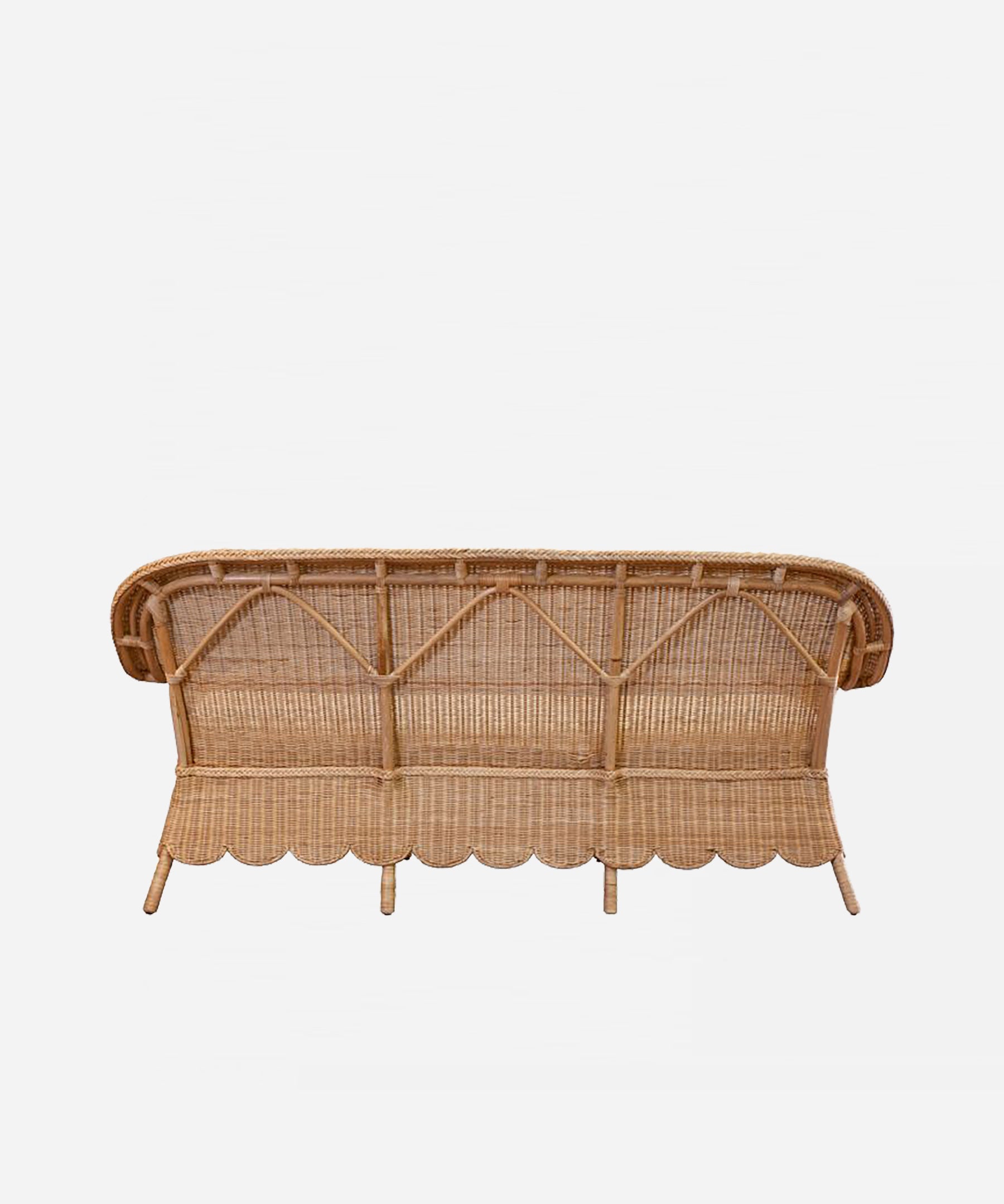 The Zaria Sofa captures the essence of coastal French elegance with its handwoven wicker craftsmanship and refined design details. Its scalloped edged skirt adds a graceful touch, creating a sophisticated seating option for your living room or covered porch. Available in different finishes and cushion fabrics, this sofa allows for personalized style that suits your refined taste.
